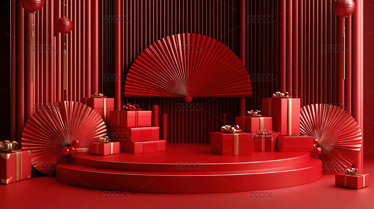 3D中式红色电商展台背景