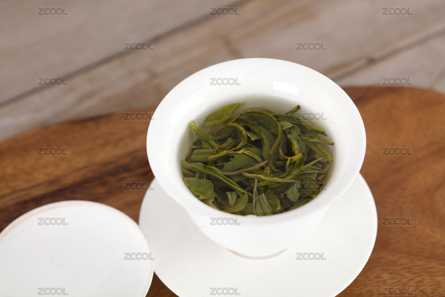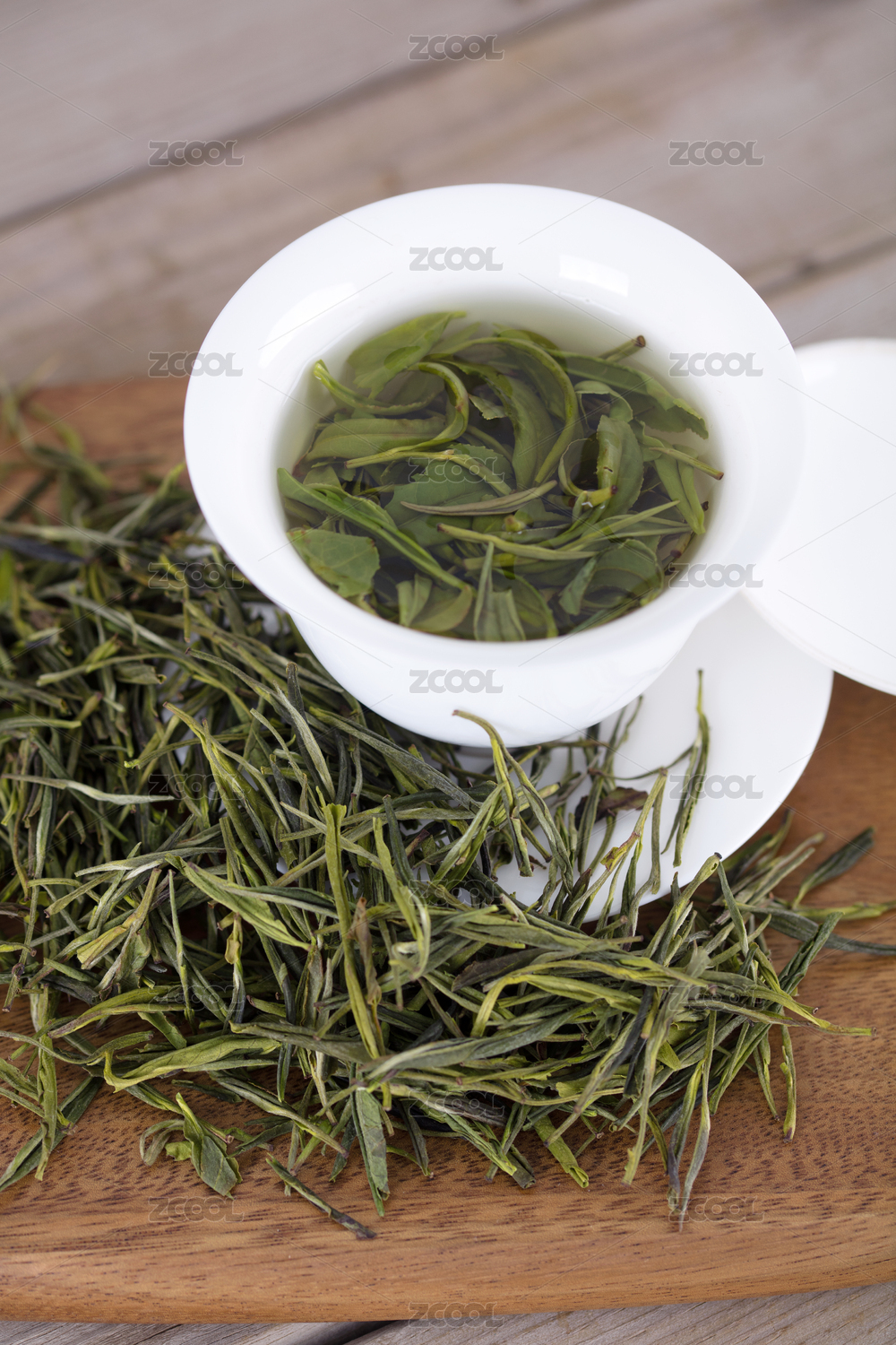 散在砧板上的绿茶茶叶和盖碗里泡着的茶汤