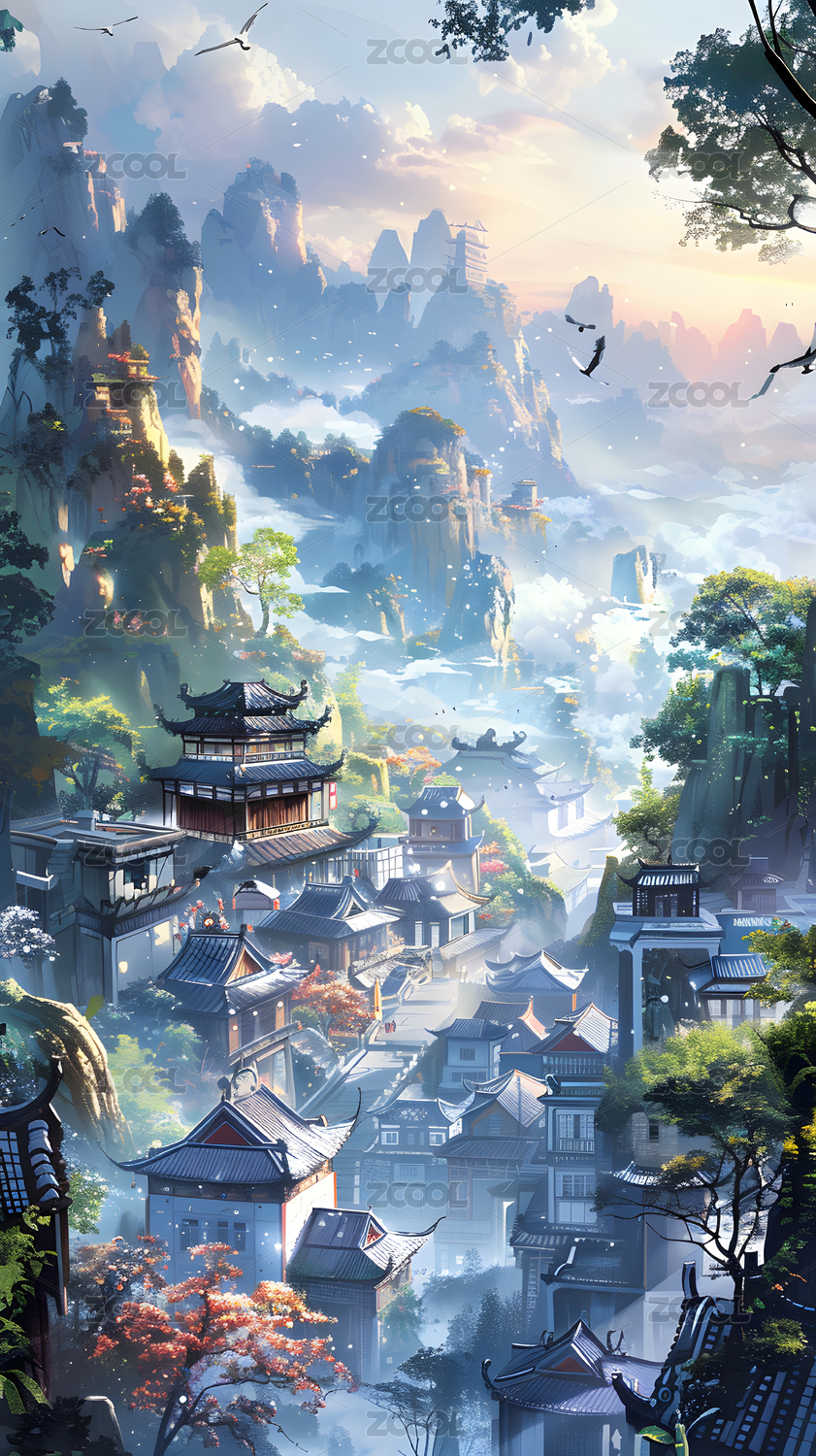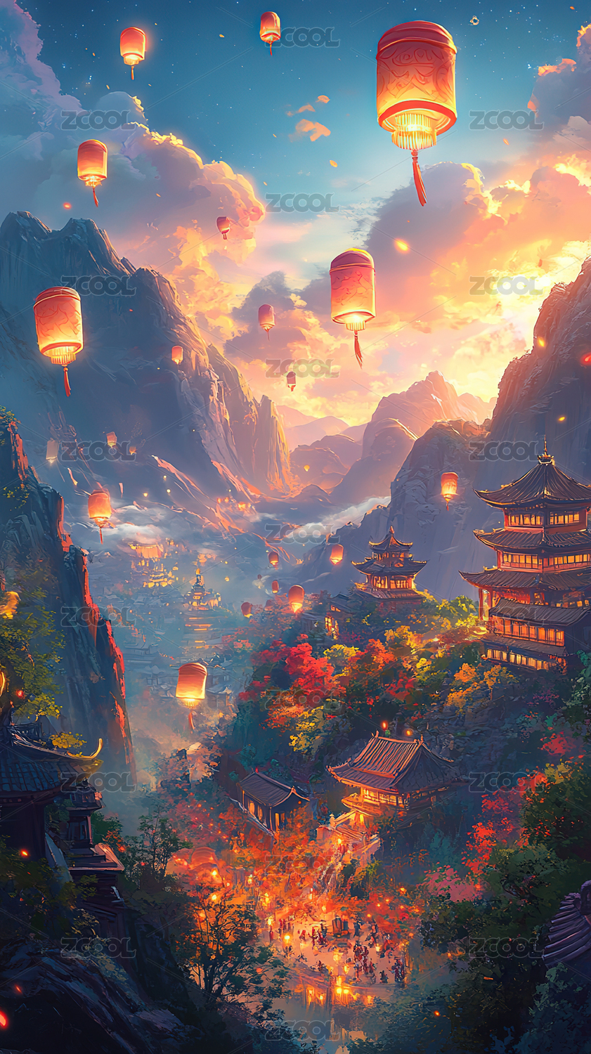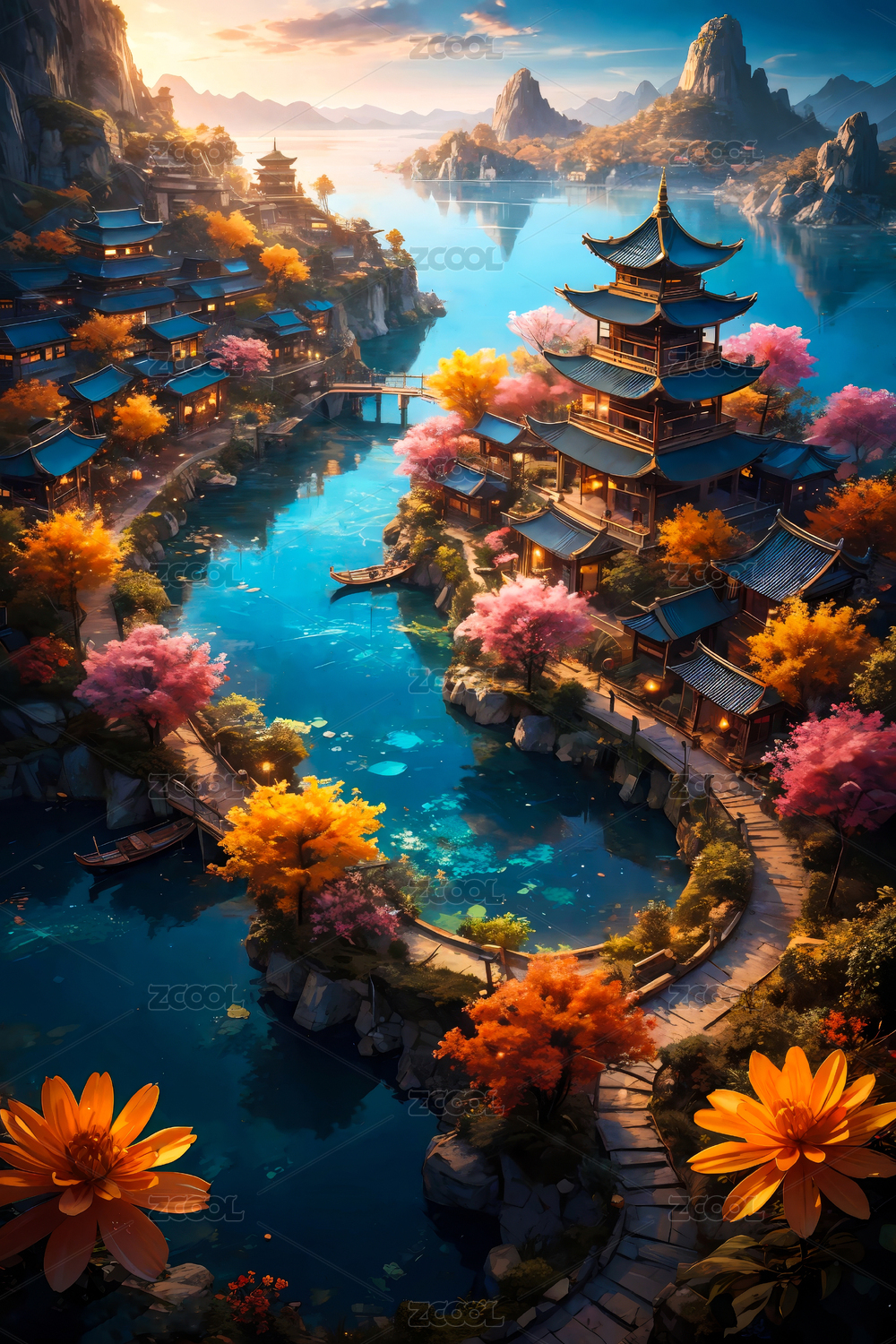 秋天魔幻山谷里的中国风建筑亭台楼阁