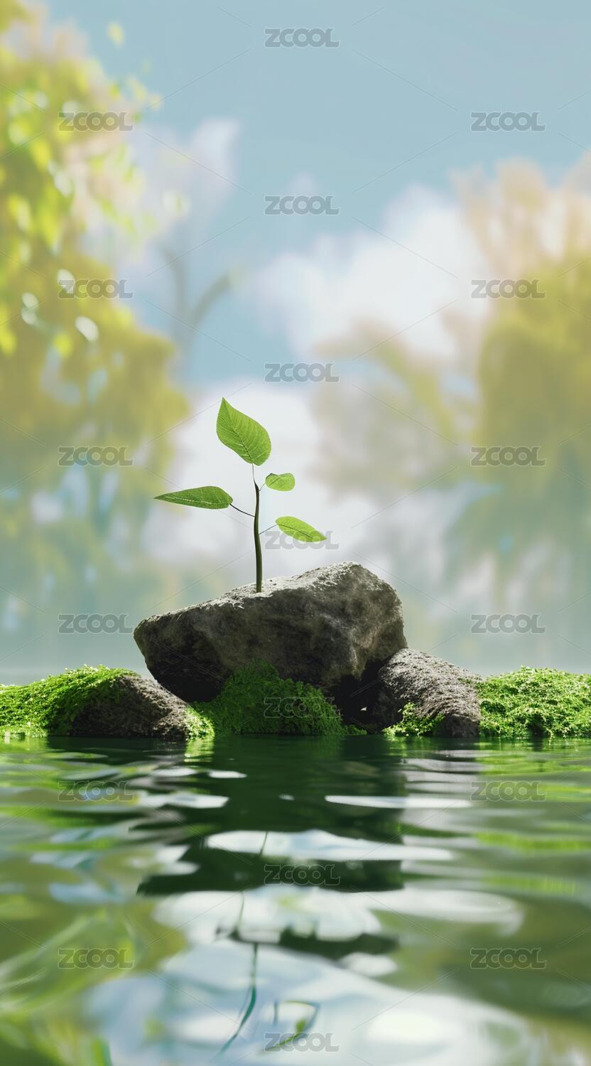 森林阳光洒在一块比较圆的长满青苔的石头上