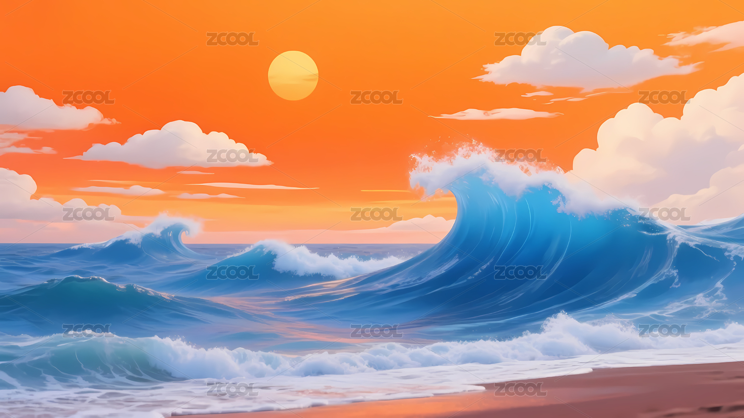 海浪与日落美景插画