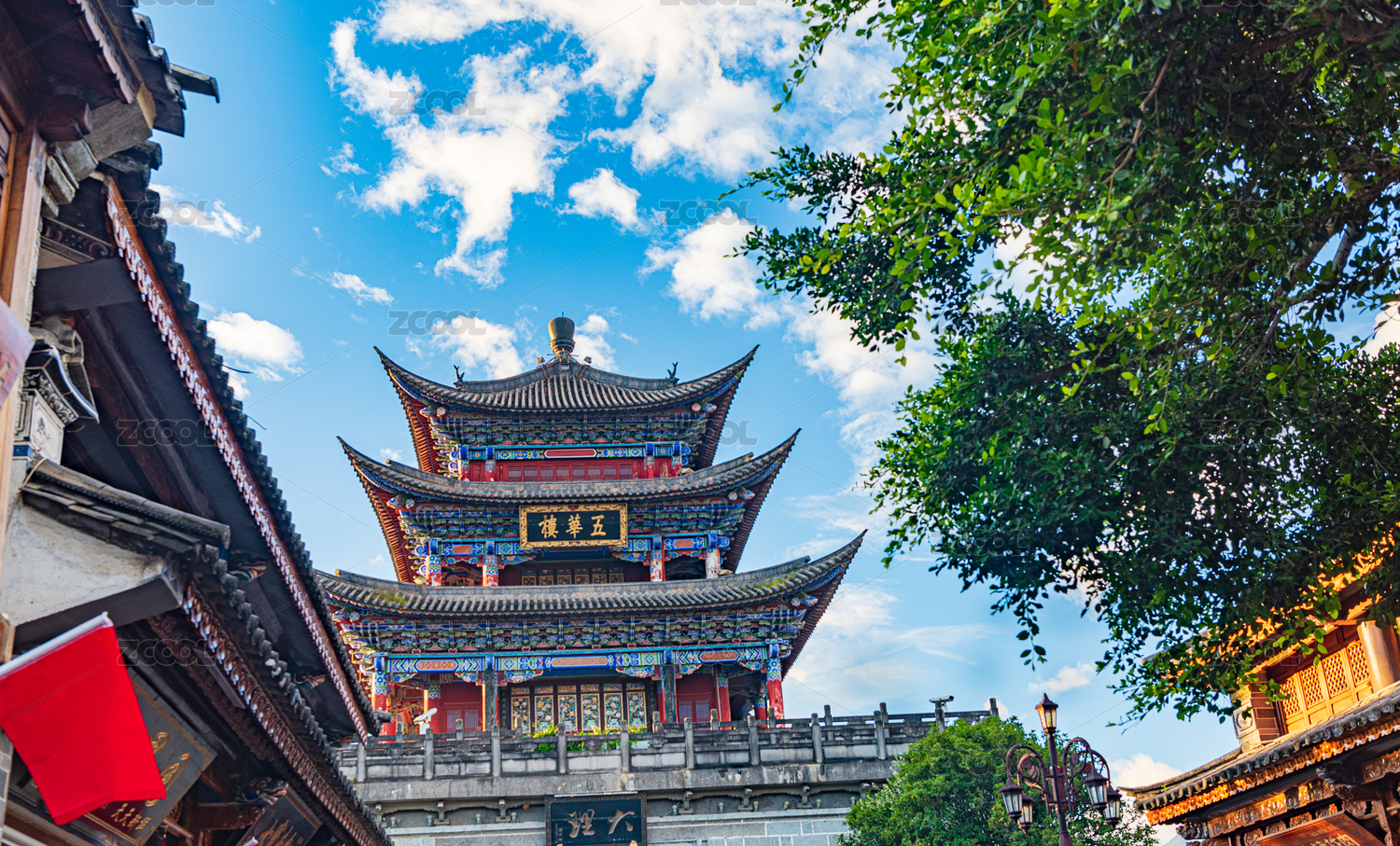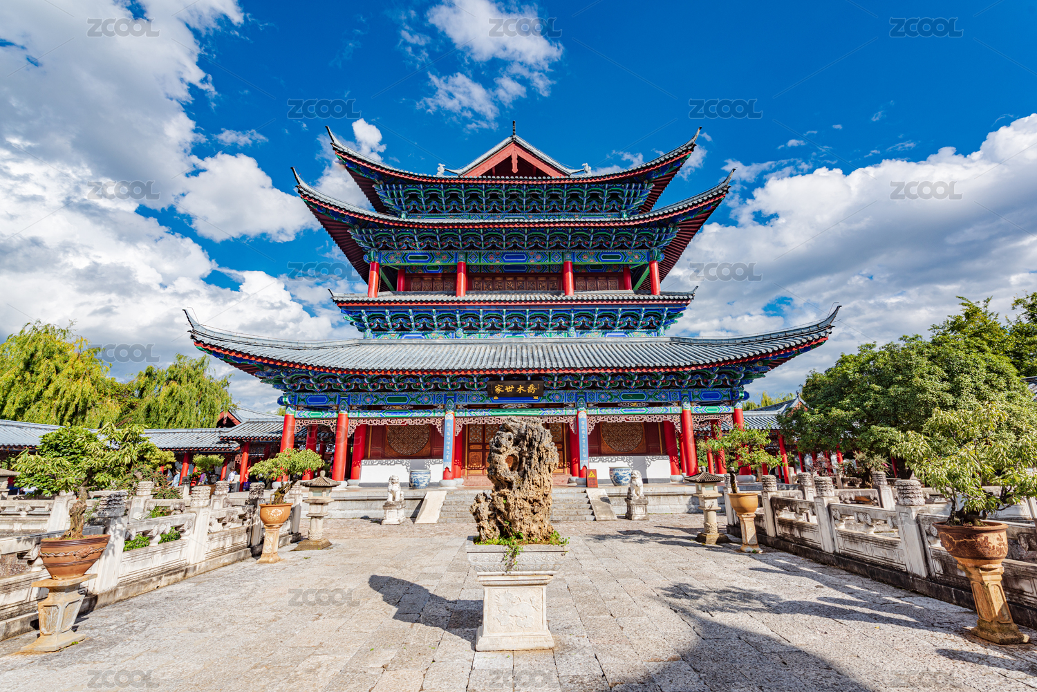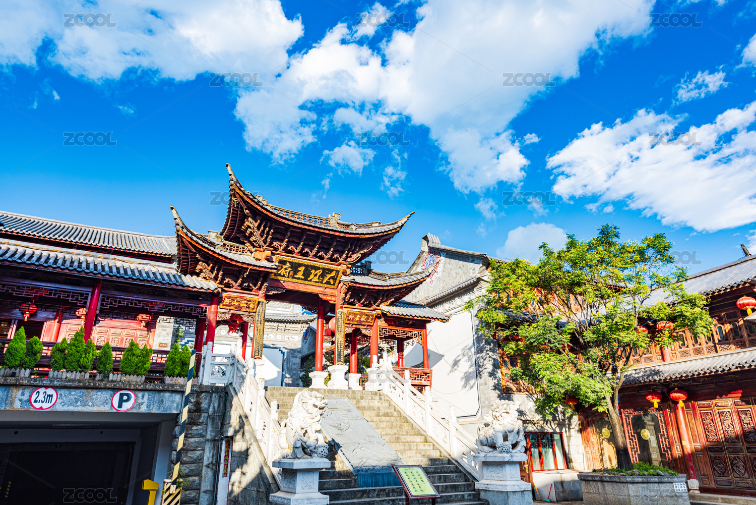 蓝天白云下的中国云南丽江古城木府建筑景观
