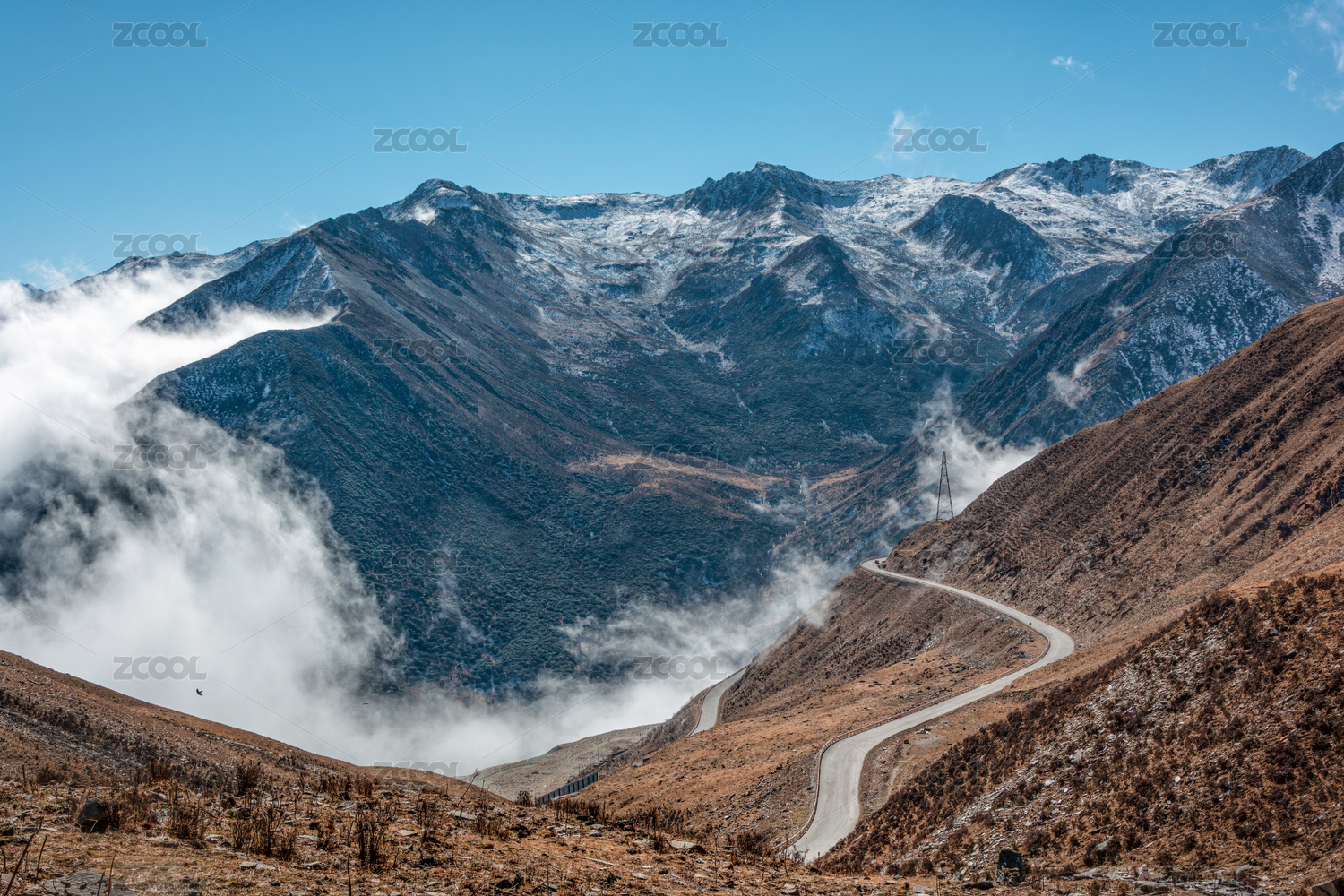 中国四川川西高原云雾缭绕的雪山