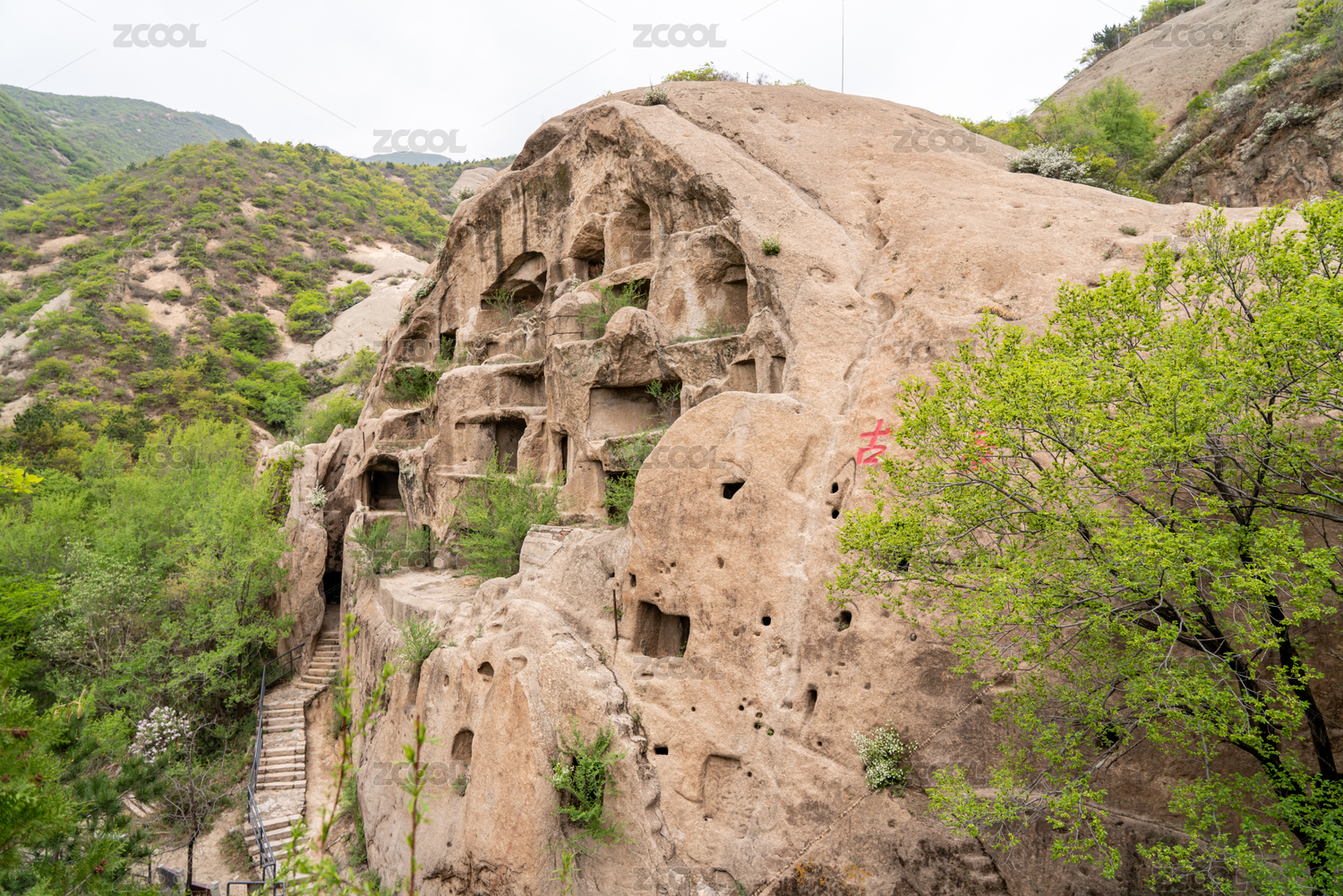 宁夏,固原,须弥山,须弥山石窟,石山,洞窟,寺庙,绿色,高视角,亭子