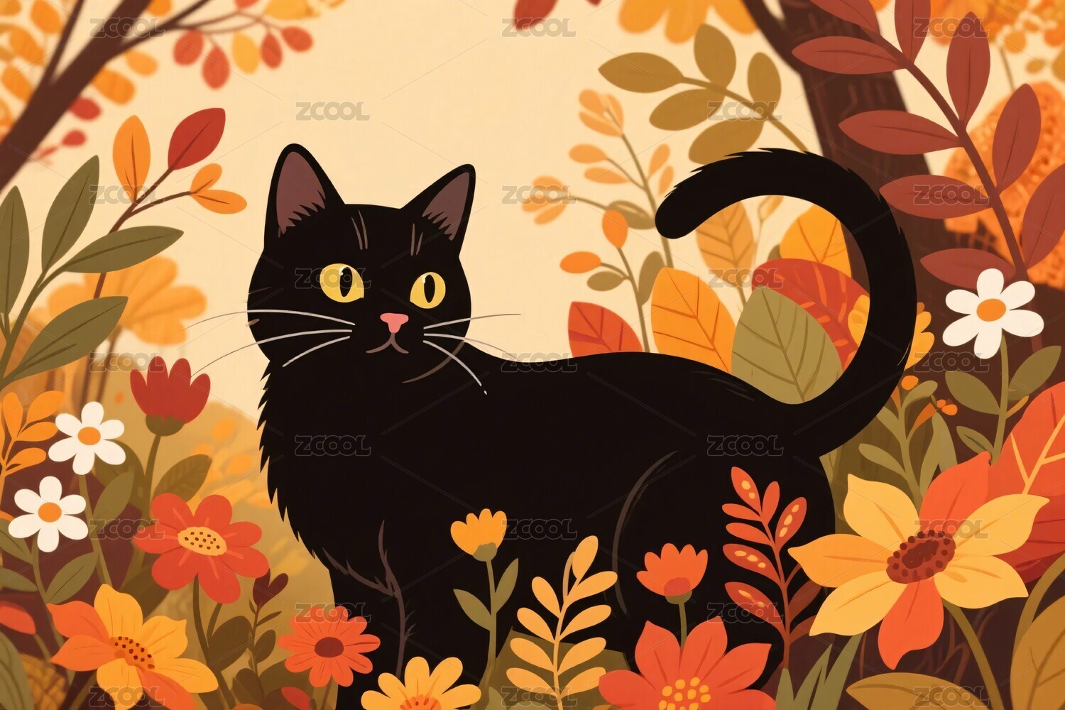 黑猫秋日花草插画