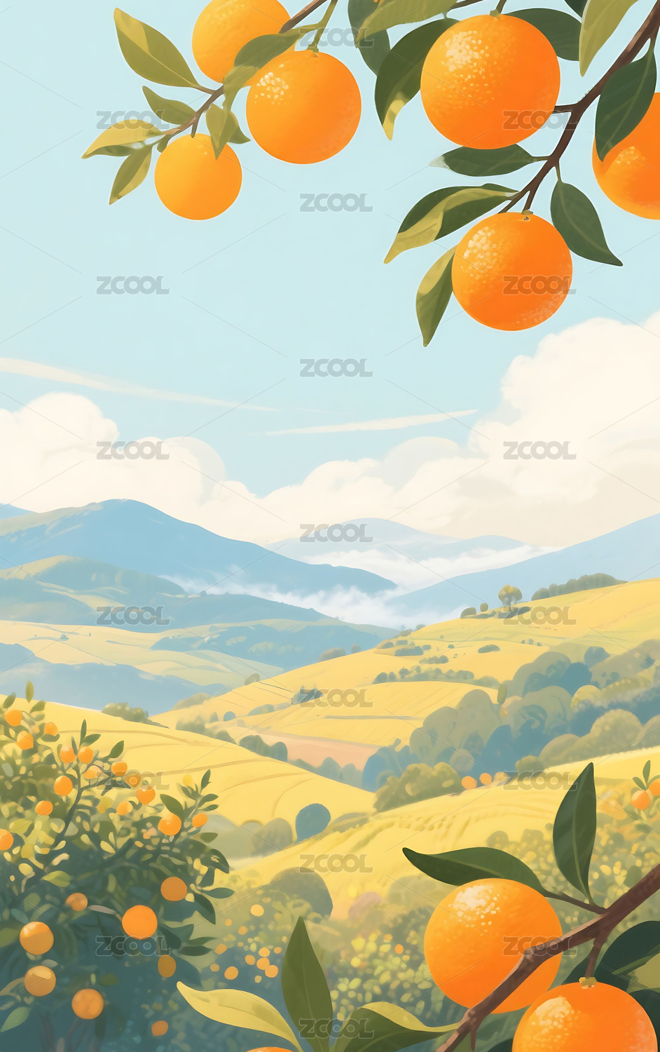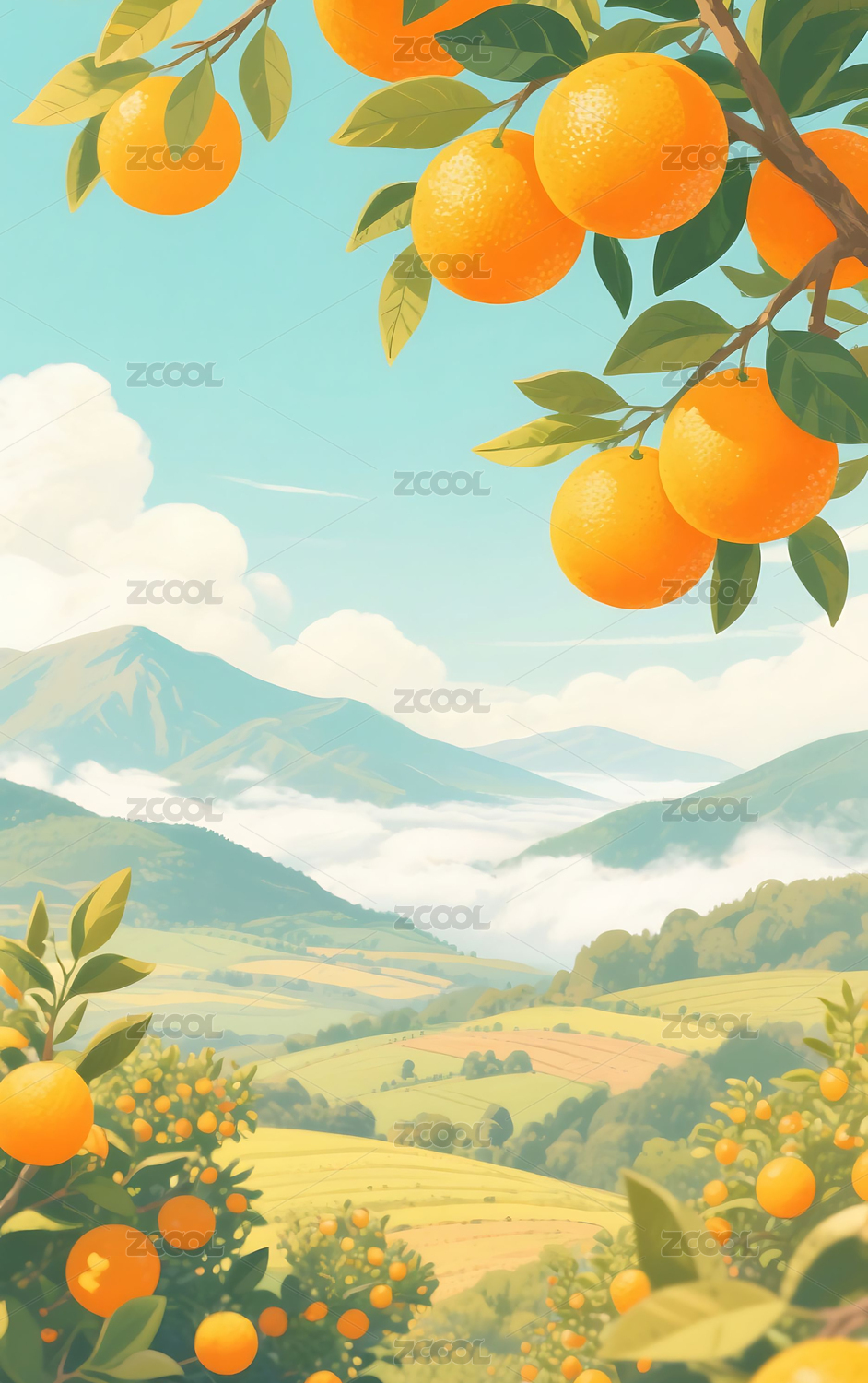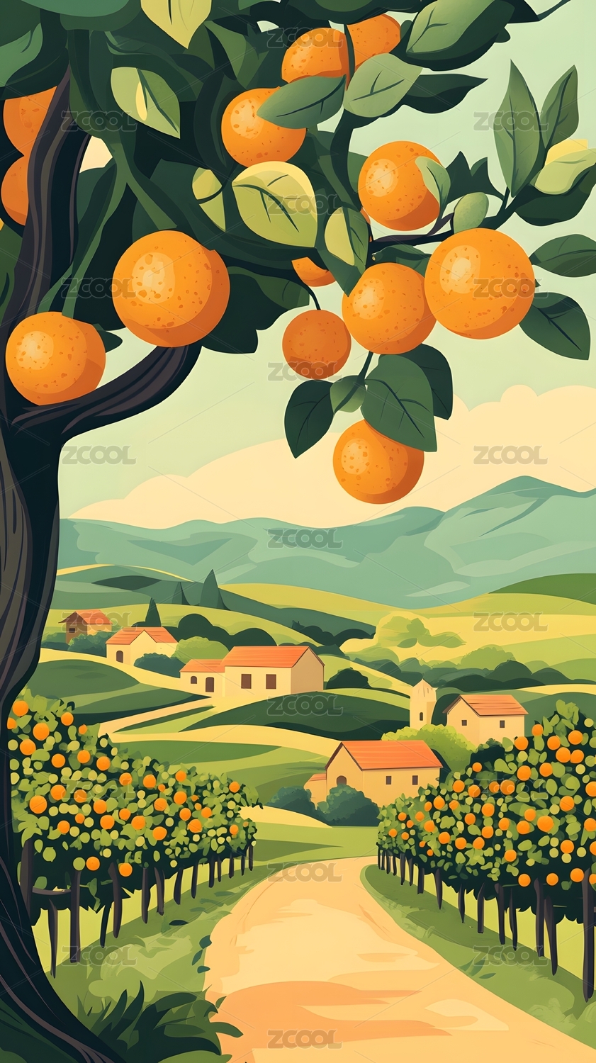 清新橘子树田园插画背景壁纸