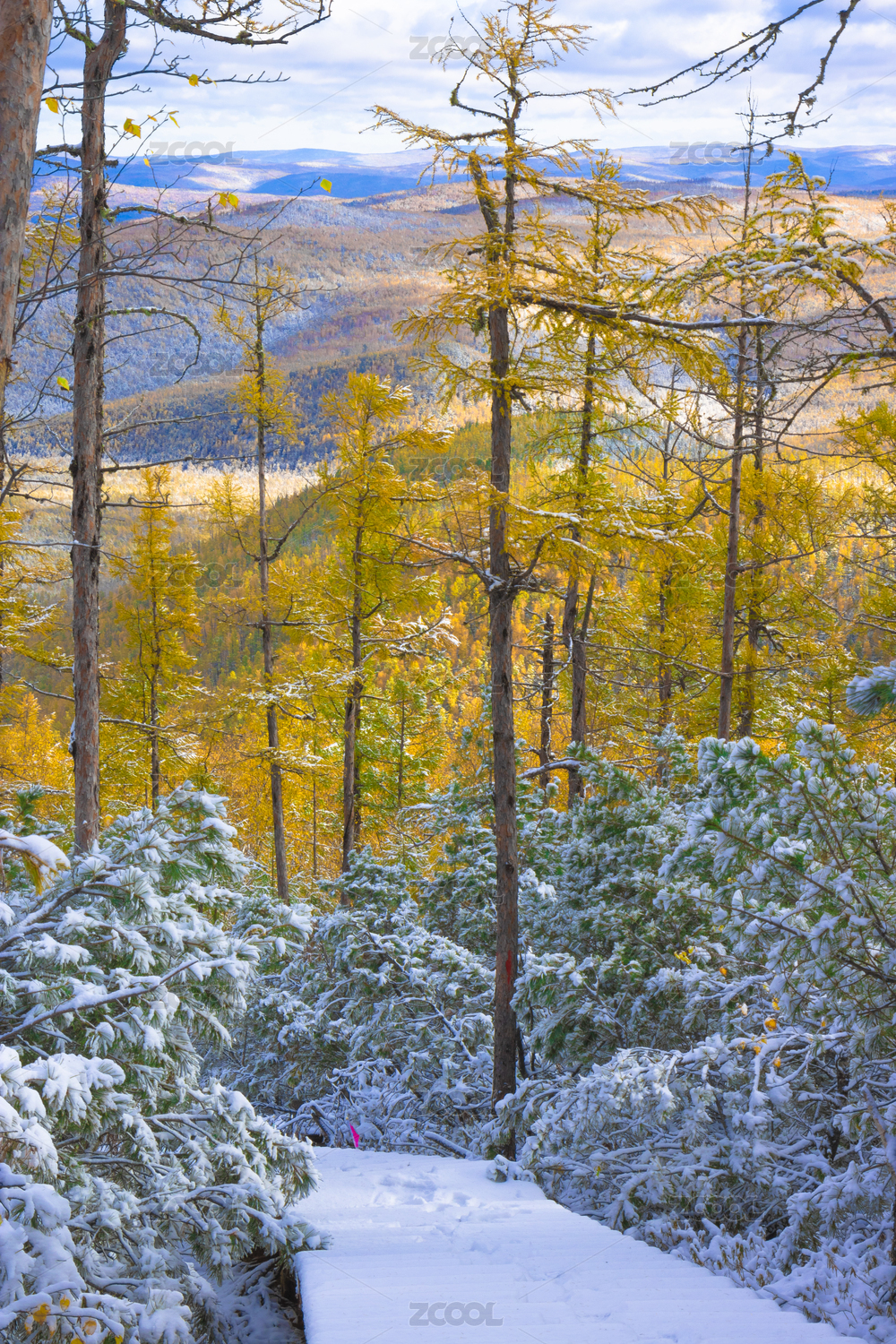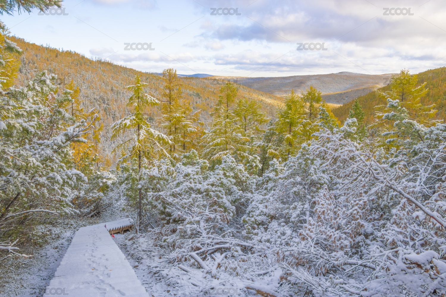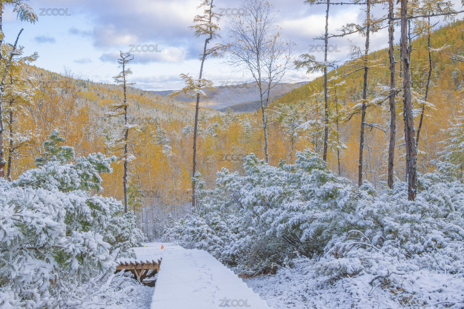 中国大兴安岭秋天小白山上铺满积雪的蛇形木栈道
