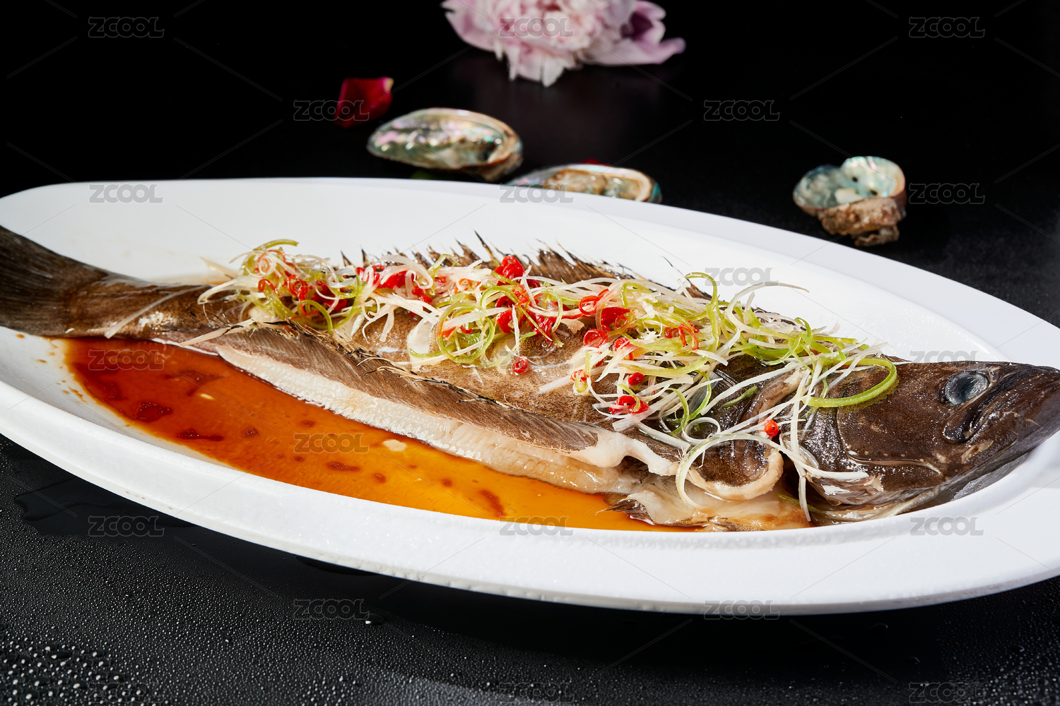 白盘里的粤菜广式葱丝耗汁清蒸鱼