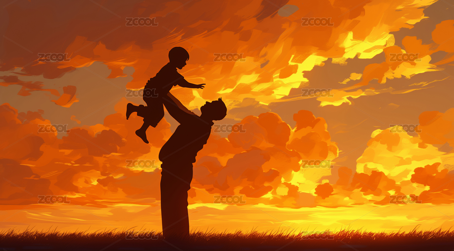 父亲节,孩子,节日,夕阳,剪影,插画,金色,唯美,壮观,亲子