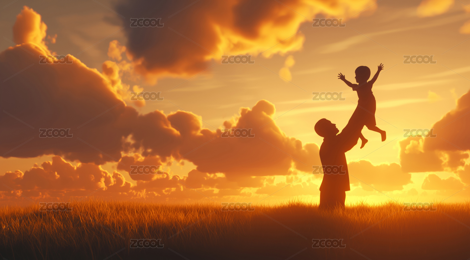 父亲与孩子在夕阳下的田野