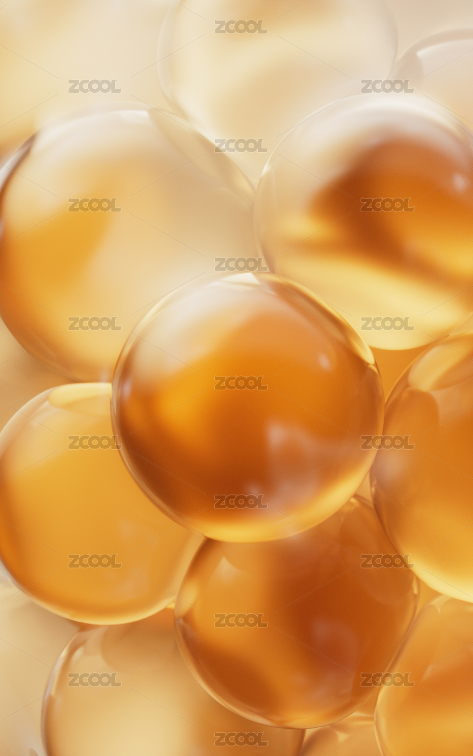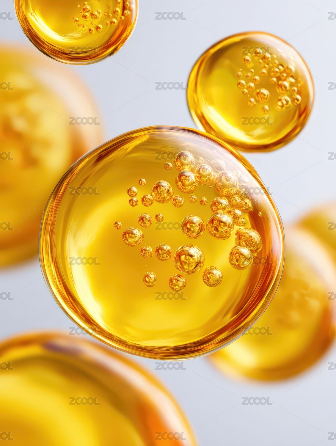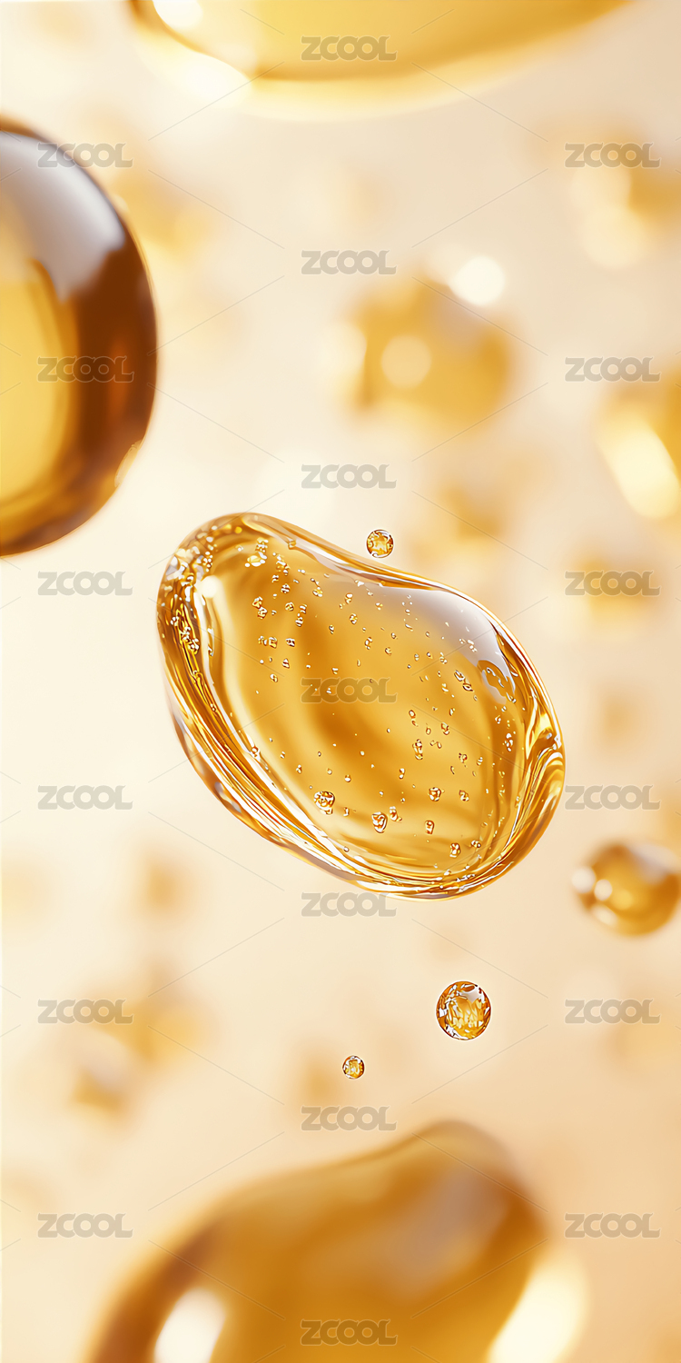 金黄色透明液滴在柔和光线下漂浮