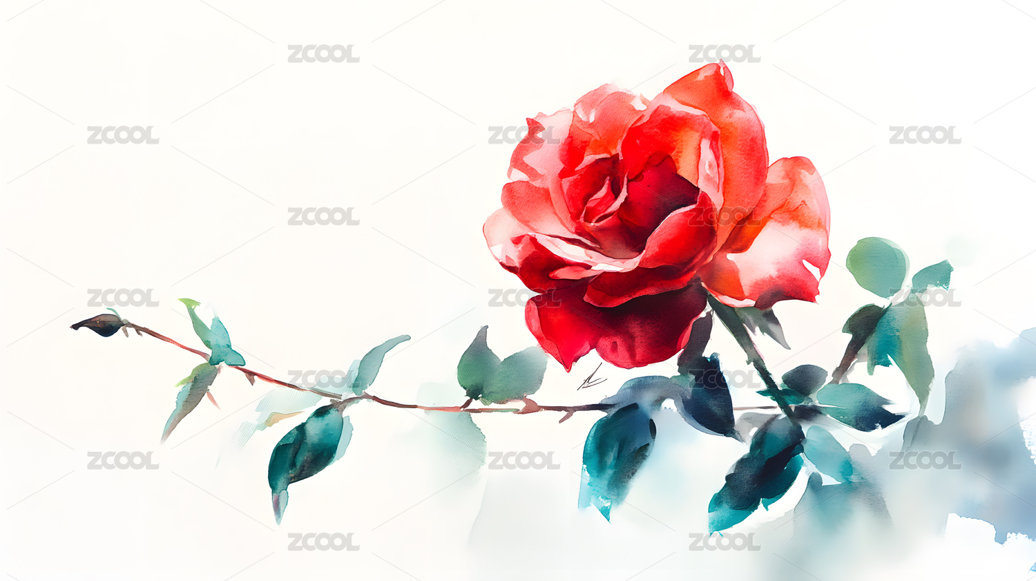 水彩红色玫瑰花枝高清图片