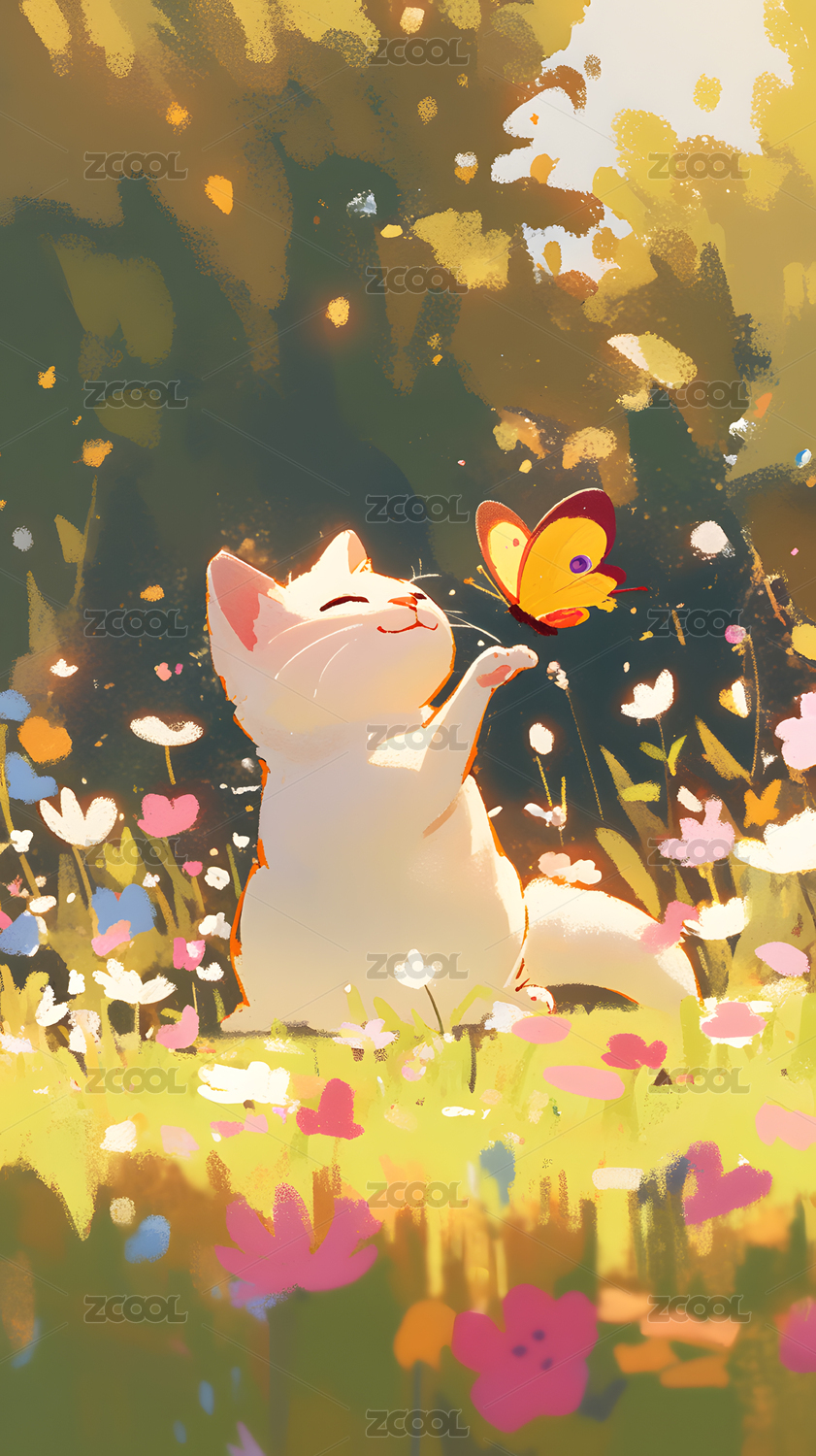 猫咪轻触蝴蝶阳光下的温馨瞬间