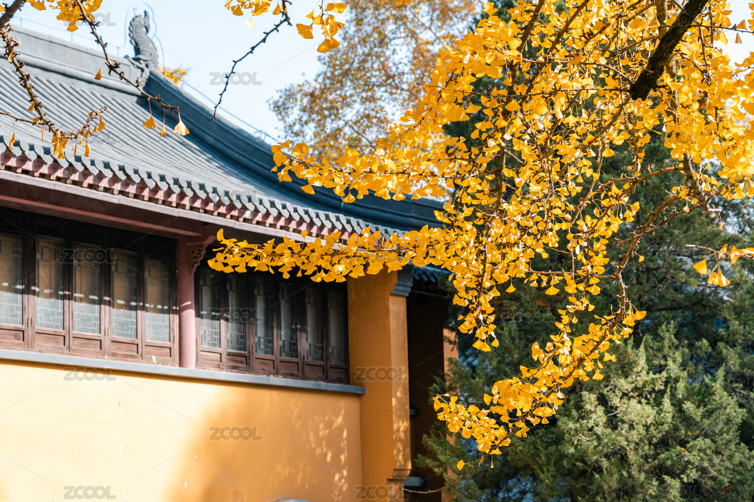 秋天寺庙的黄墙与金色的银杏树