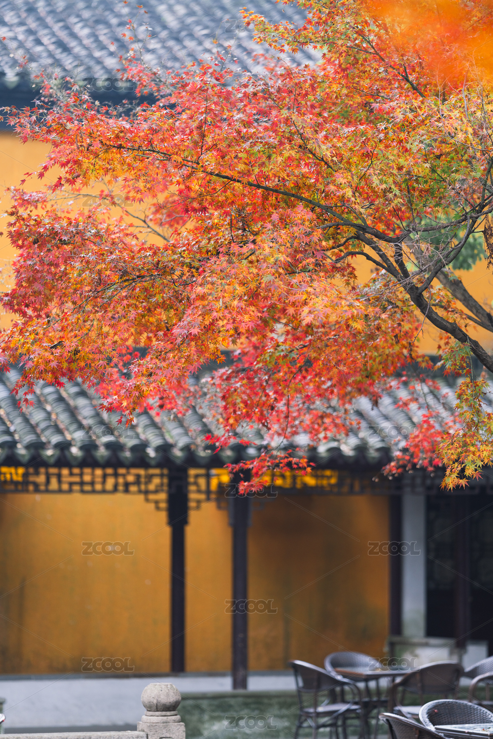 杭州西湖飞来峰景区法喜寺墙外红色枫树