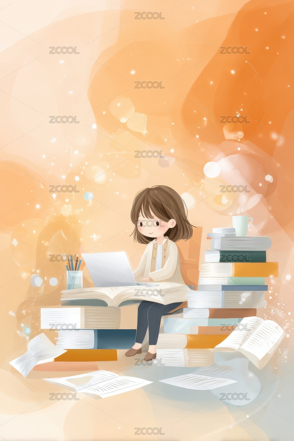 女孩走上书本堆成的道路