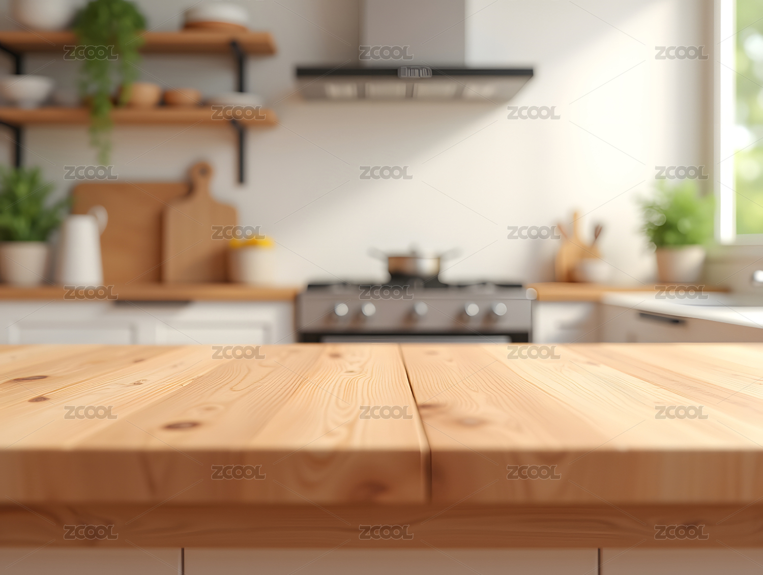 温暖自然光下的木质空桌与厨房背景