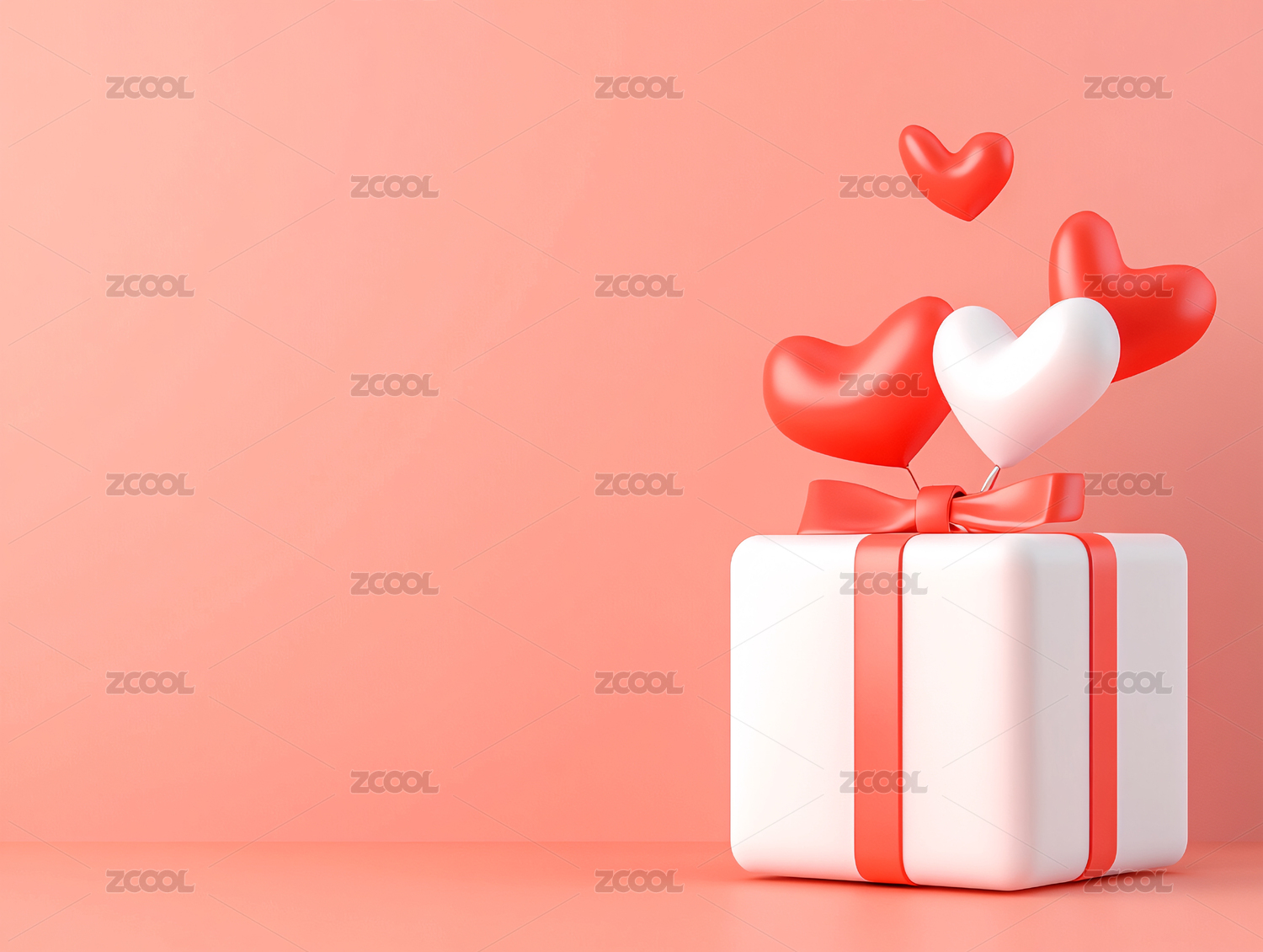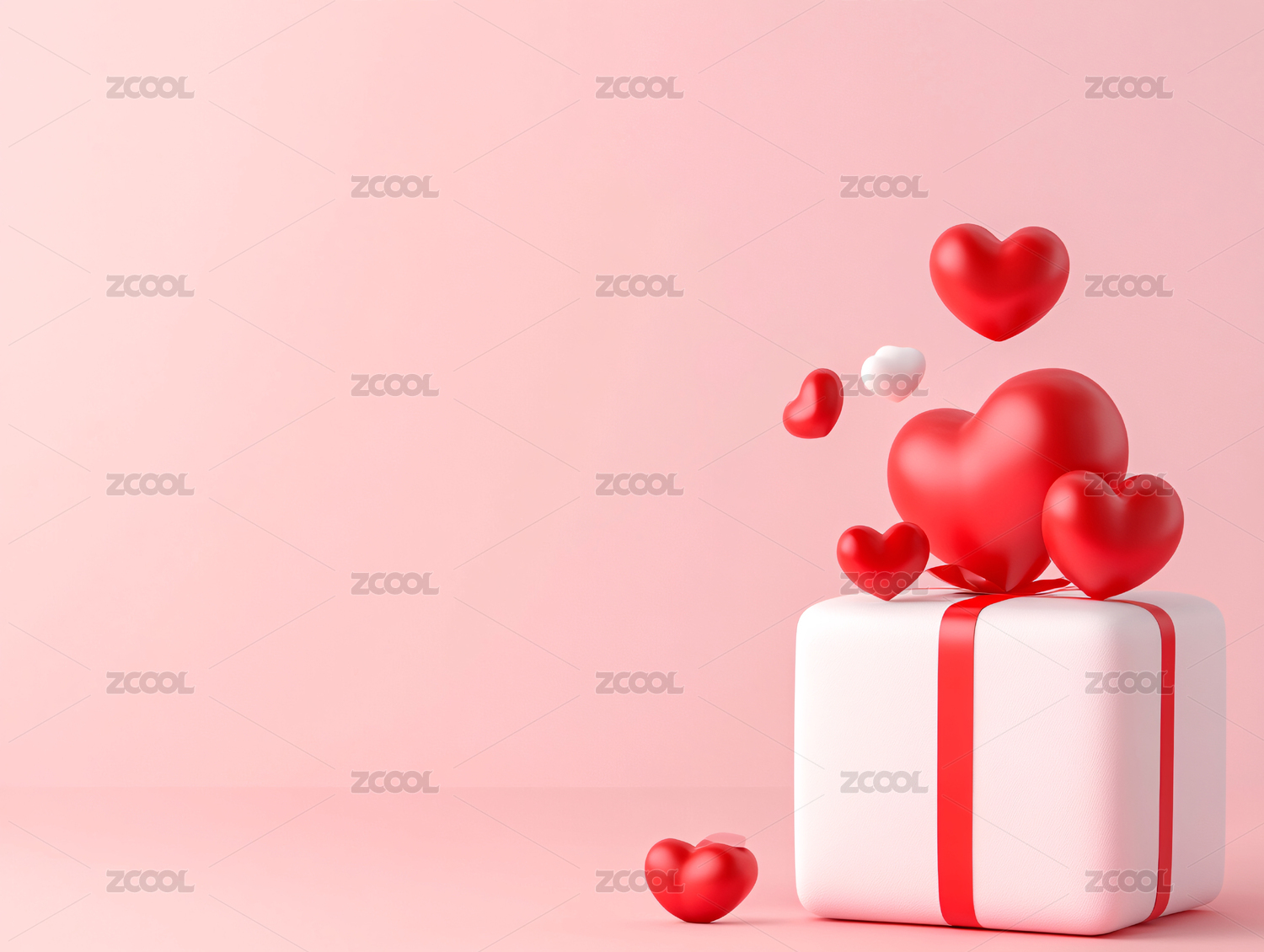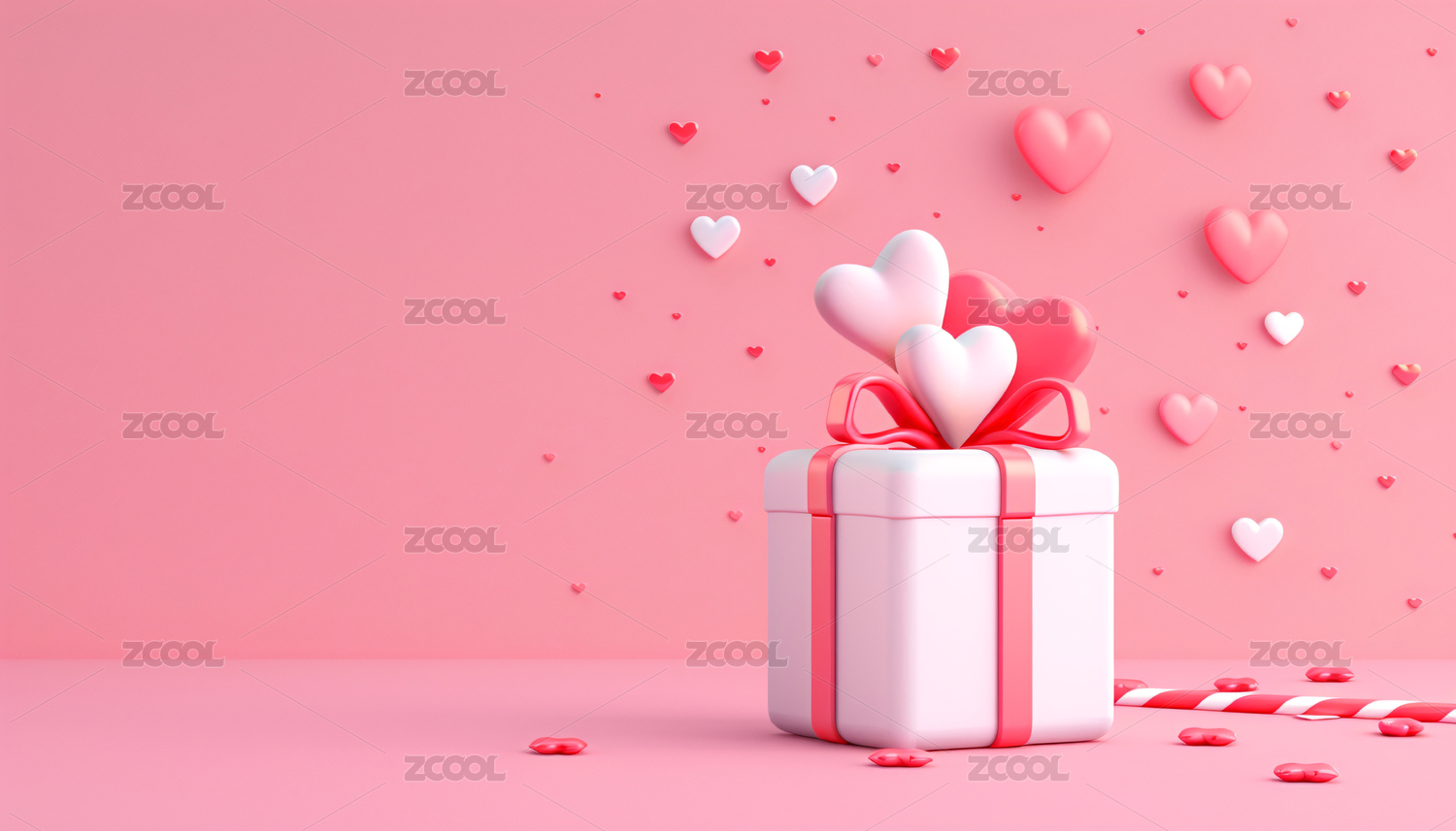 绑着丝带的礼品盒周围有许多爱心形状