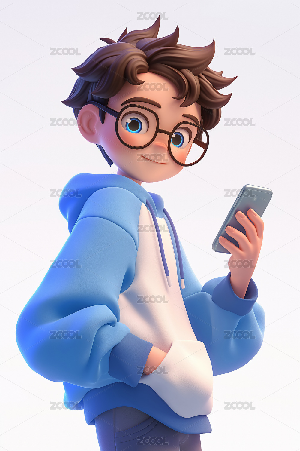 3D渲染可爱卡通戴眼镜的男孩人物插画
