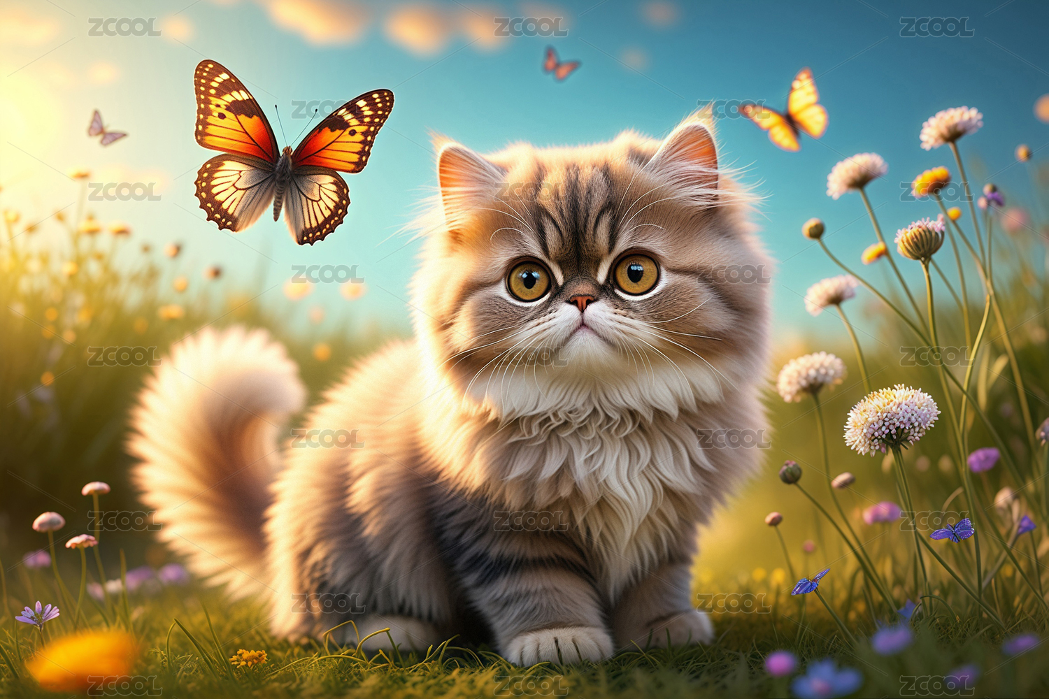 白猫凝视蝴蝶的梦幻场景