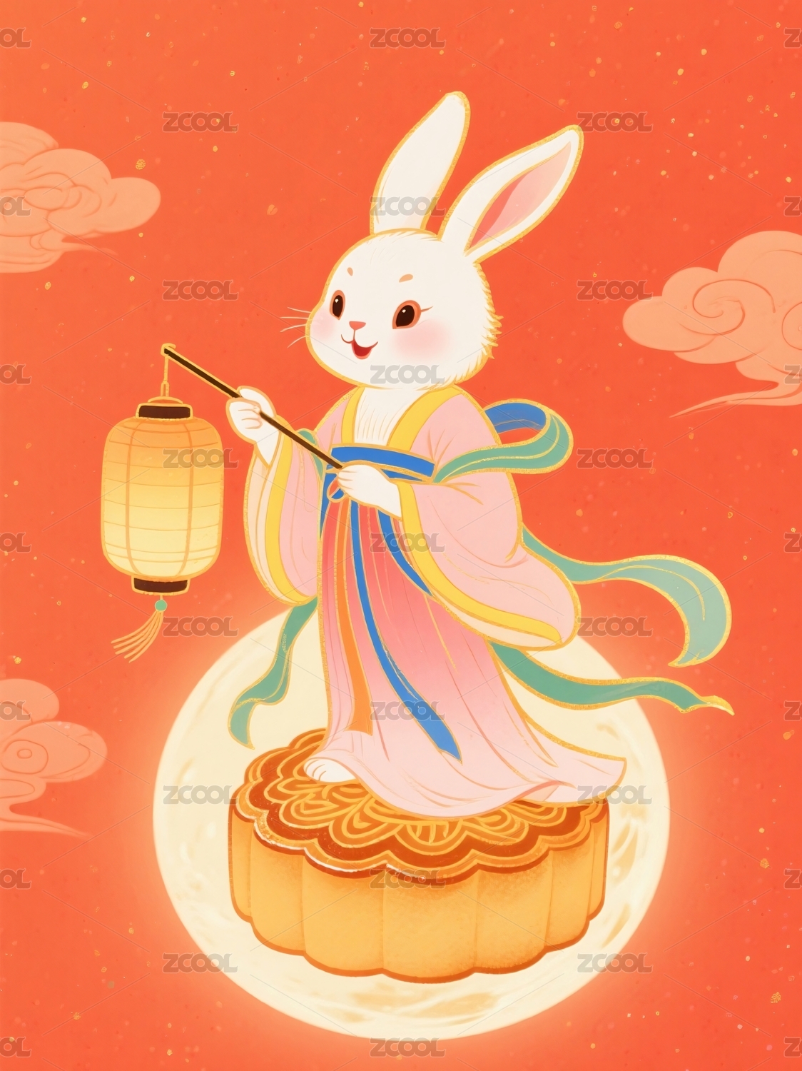 中秋节兔子月亮桂花月饼灯笼等国潮风插画