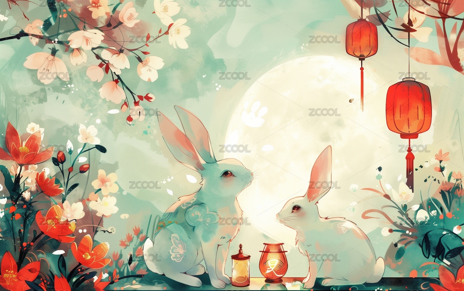 兔子玉兔桂花灯笼可爱新中式风格插画