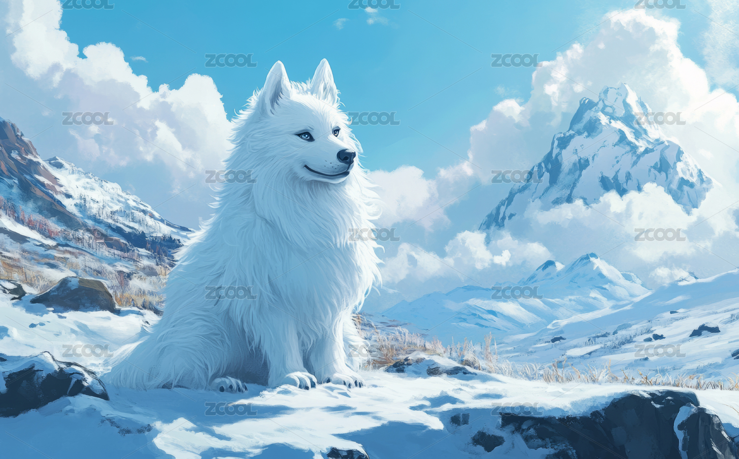 一只白色的狼站在雪山前