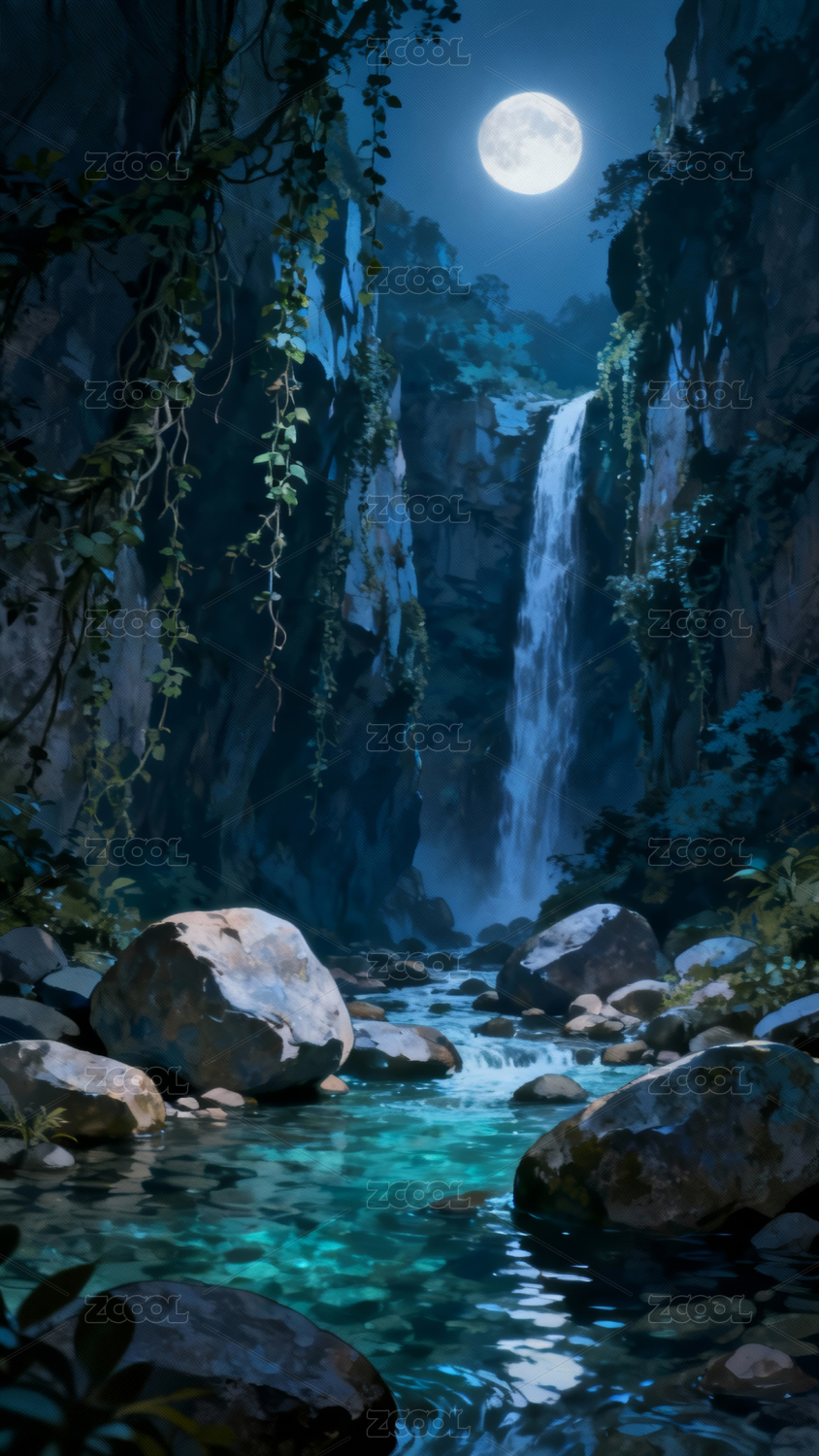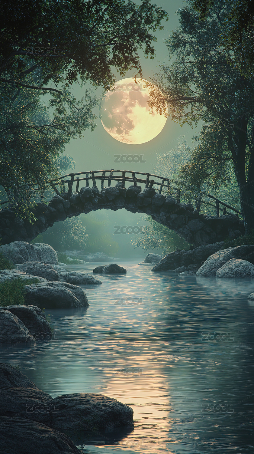 3D,壁纸,夜晚,AI数字艺术,树木,高清,月光,山村,河流,宁静