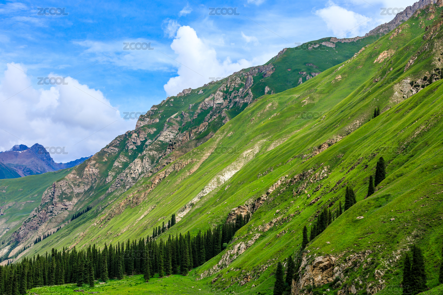 蓝天白云下中国新疆伊犁草原森林美丽风光