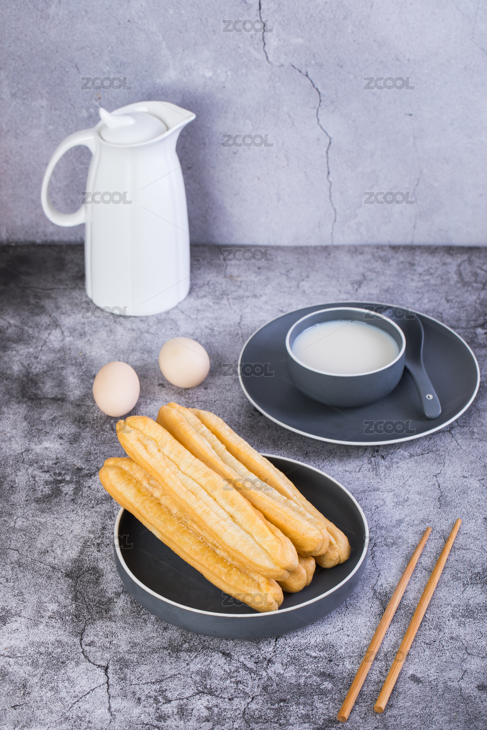 豆浆油条茶叶蛋特写格子桌布背景