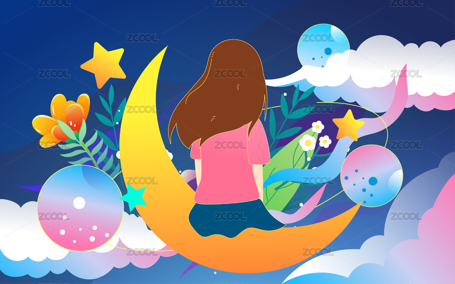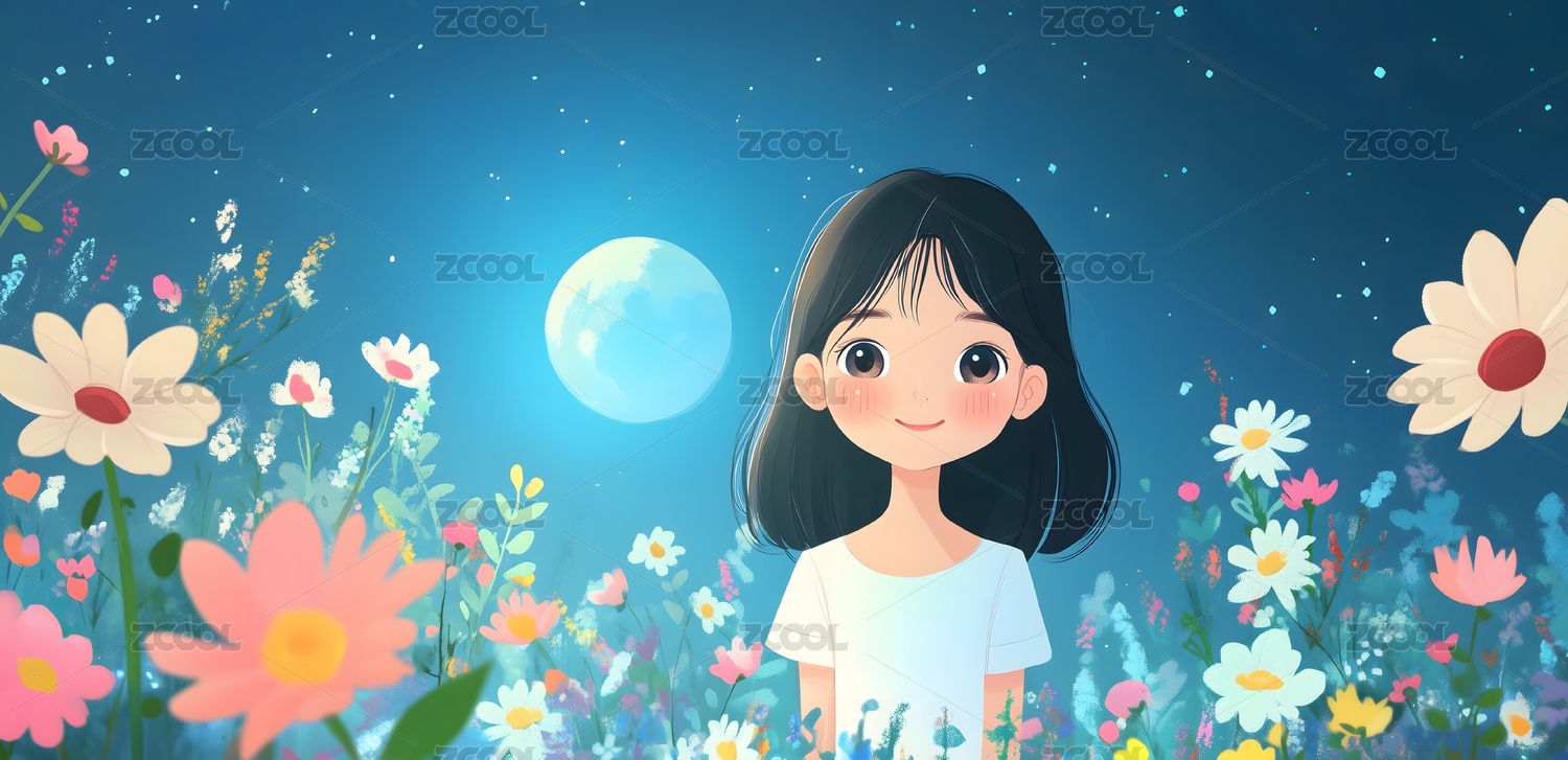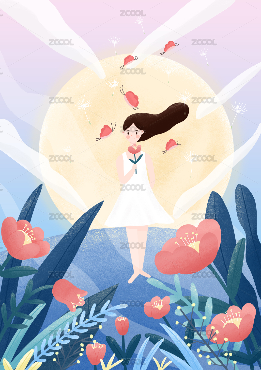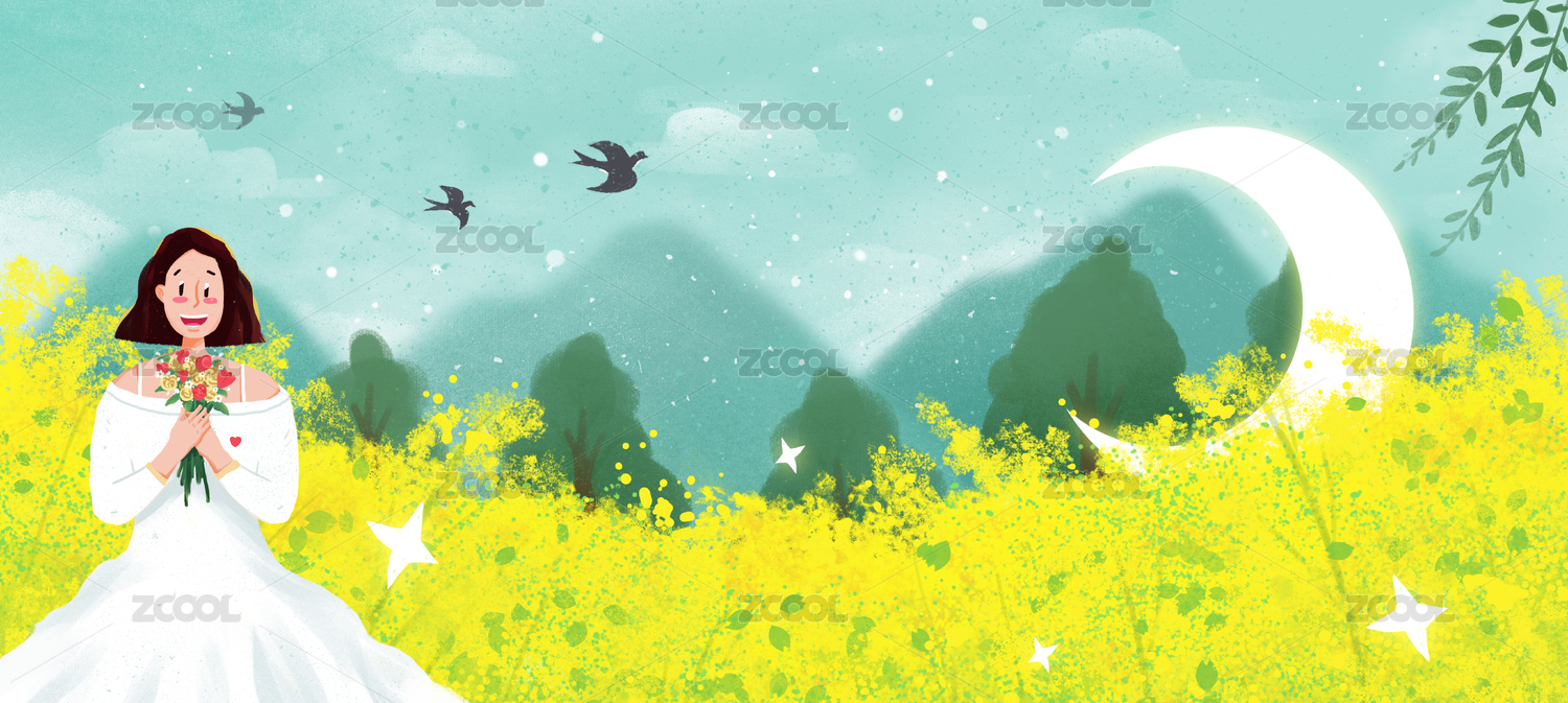 春天里油菜花下拿着鲜花的女孩和月亮长图