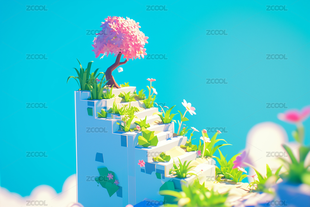 春天白天鲜花盛开山间台阶小路3D卡通插画