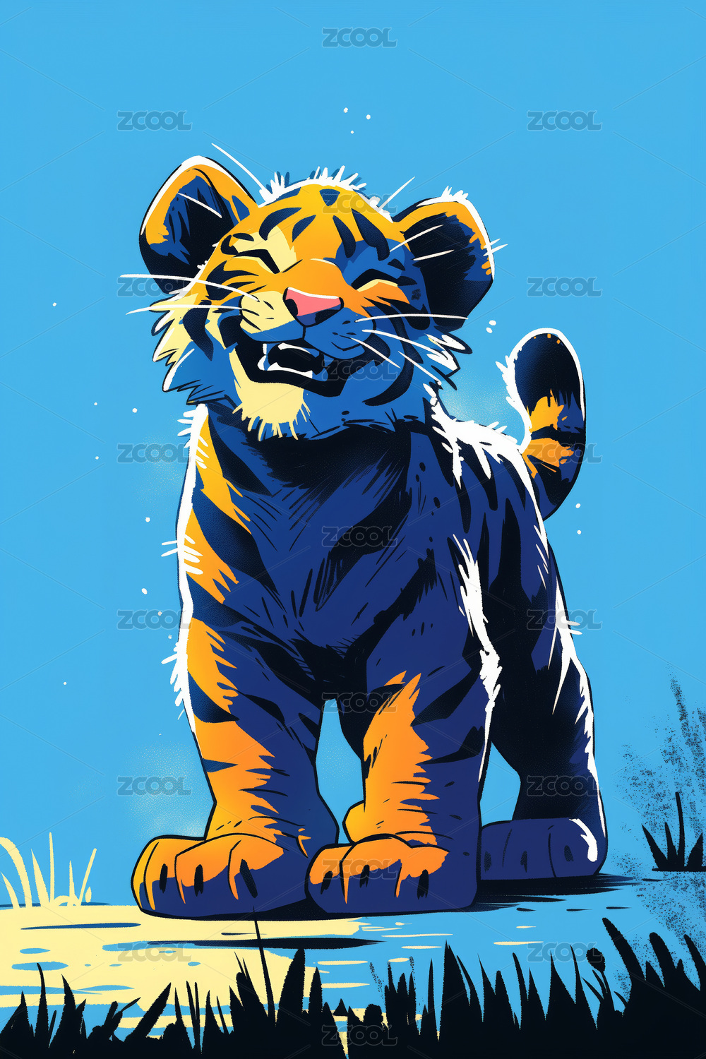 清新,明亮,一只,卧着,休息,老虎,扁平,插画,绘画,涂鸦