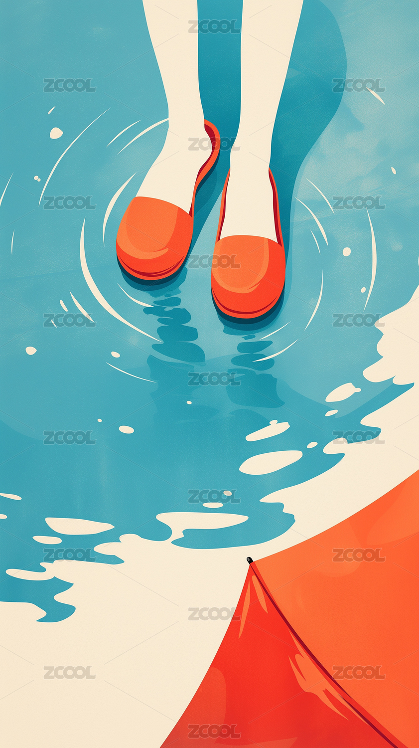 清新明亮水渍的地面一双高腰雨鞋插画绘画