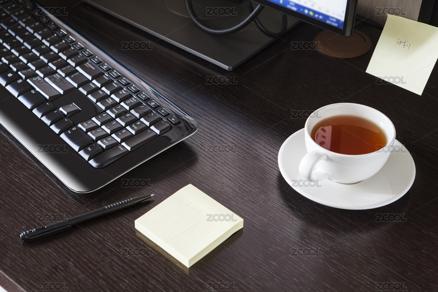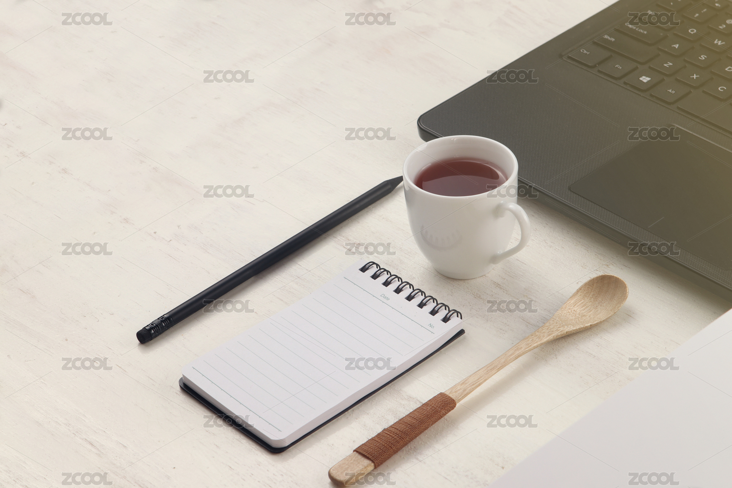 笔记本电脑搭配咖啡杯套装办公桌喝咖啡工作概念