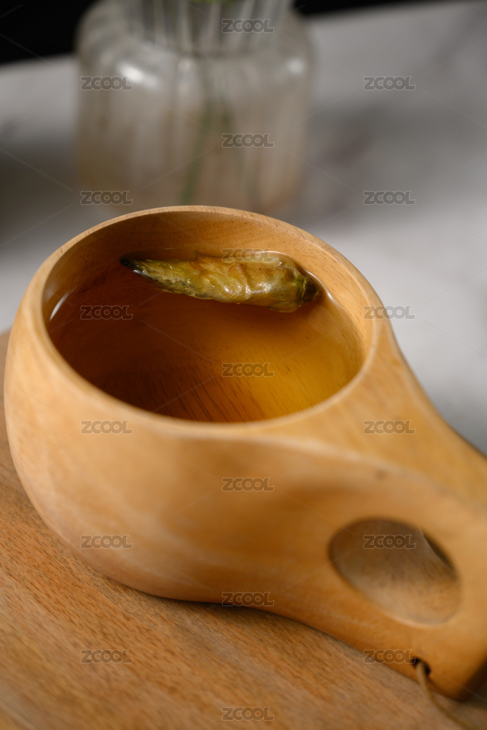 桌面上的杯子里的甘甜可口的金盏菊花茶