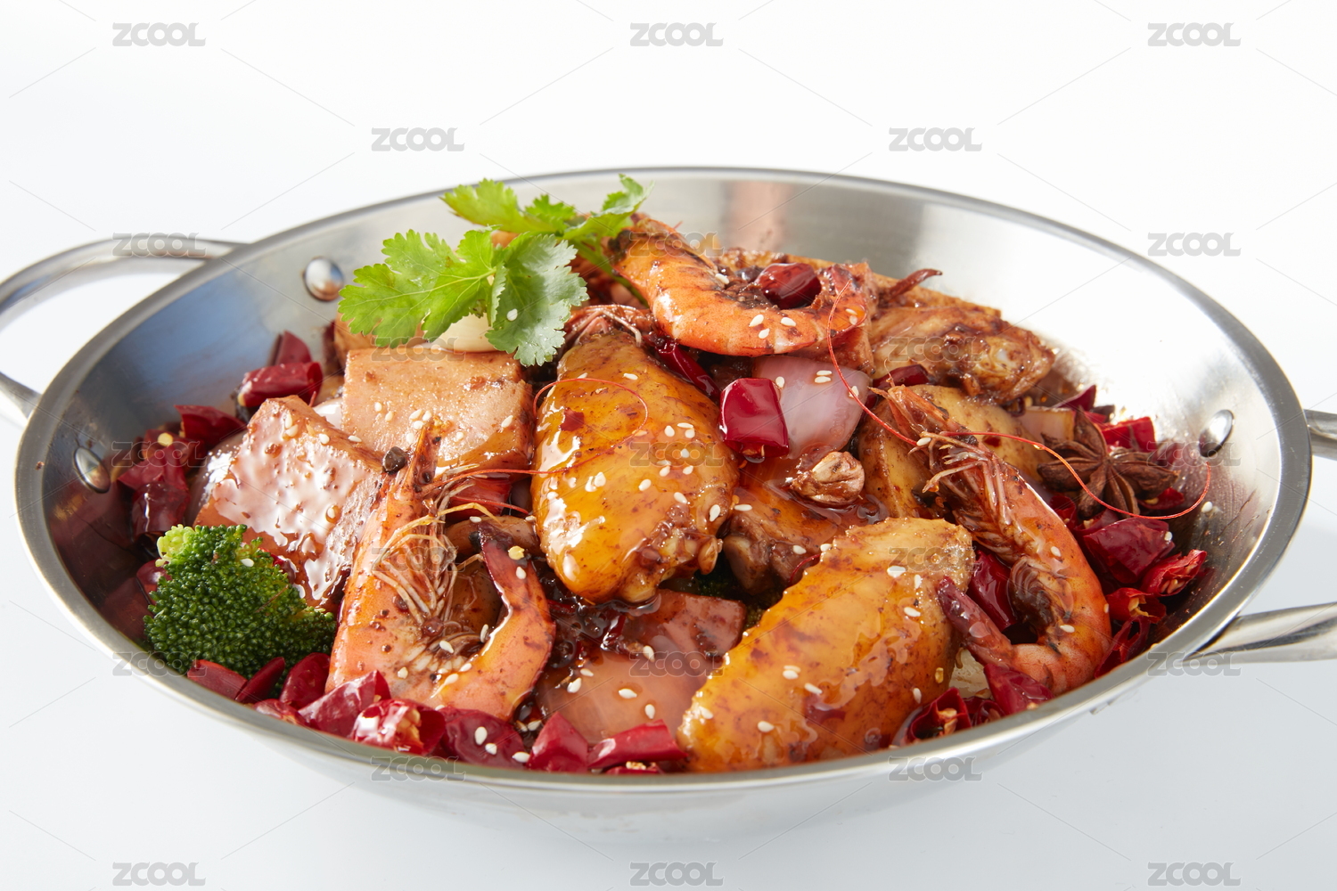 不锈钢锅里的麻辣干锅鸡翅大虾