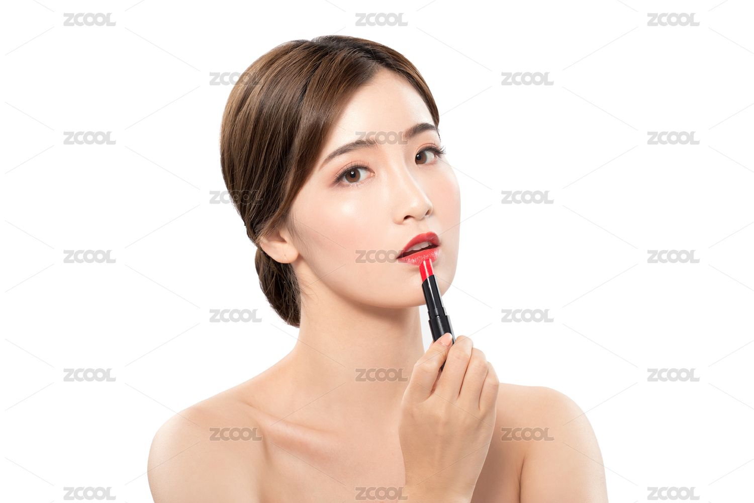 灰色背景里正在涂口红的亚洲美女面部特写,化妆护肤整容