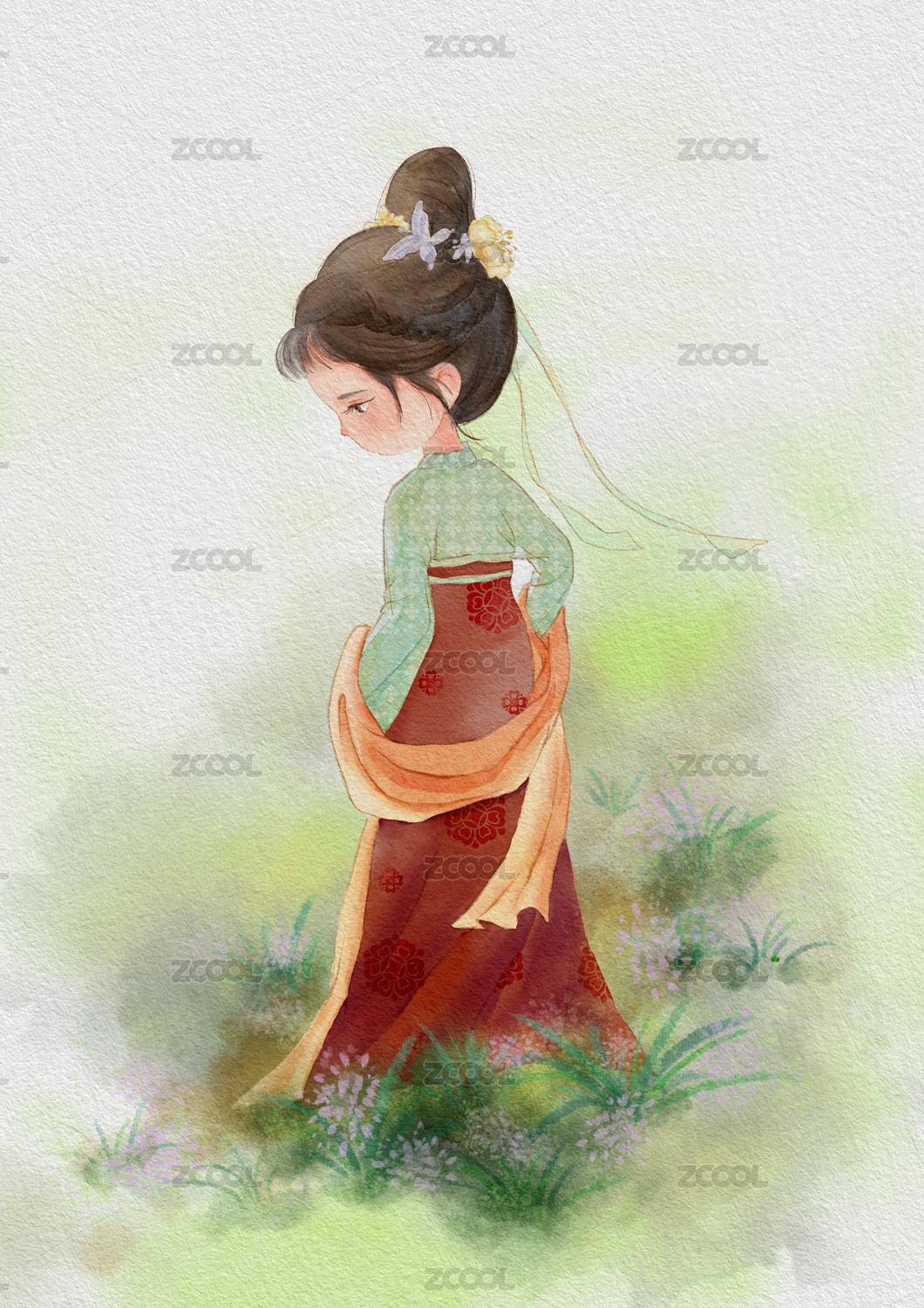插画,儿童插画,女孩儿,古装,发呆,花,蝴蝶,摘花,夏天,古风