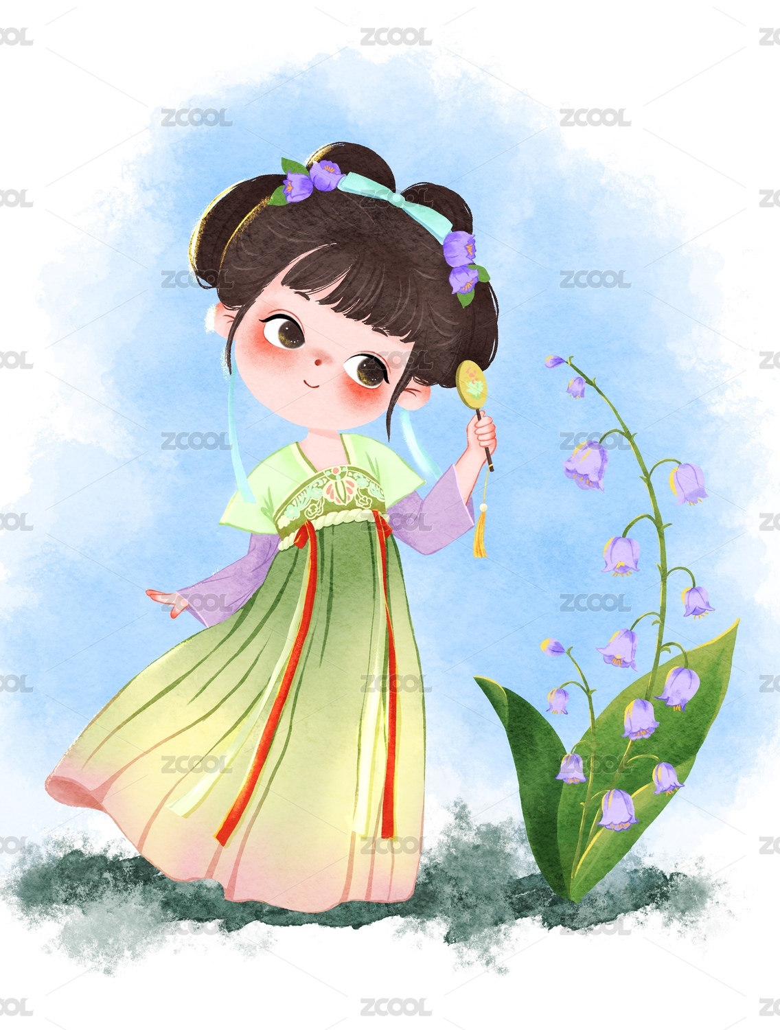 Q版古风人物正面铃兰花旁跳舞女孩