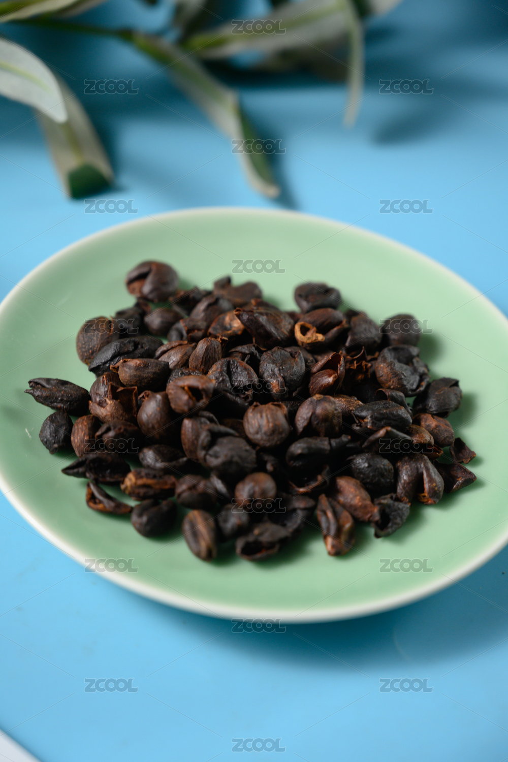 桌面上的盘子里的干爽的咖啡果皮
