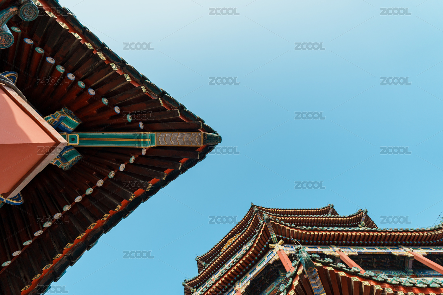 中国古寺庙建筑屋角飞檐琉璃瓦特写