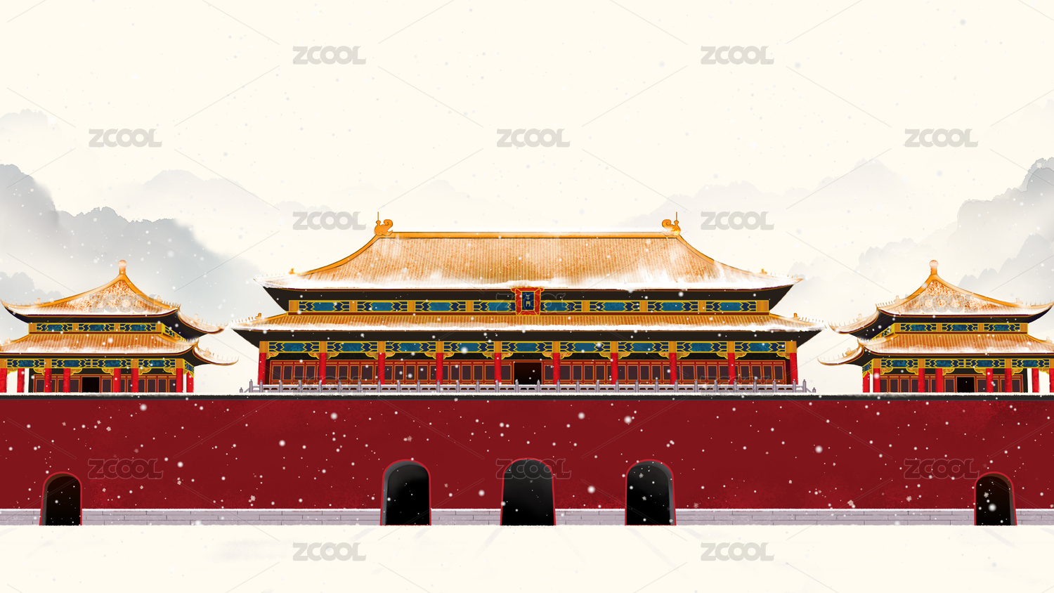 红色古建筑宫殿墙壁柿子树下雪雪景插画背景