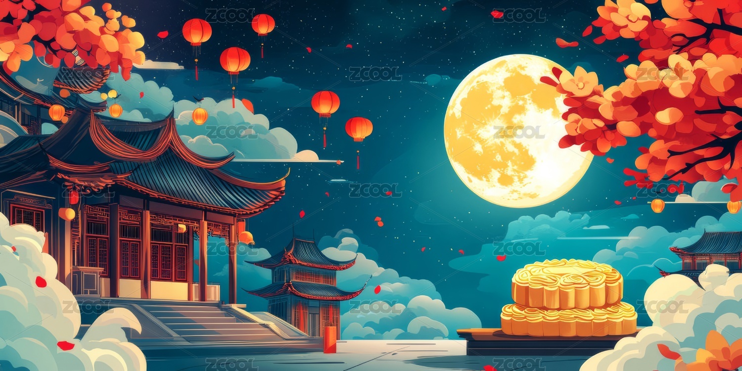 满月,背景,灯笼,中秋节,月亮,夜晚,插画,天空,自然,建筑