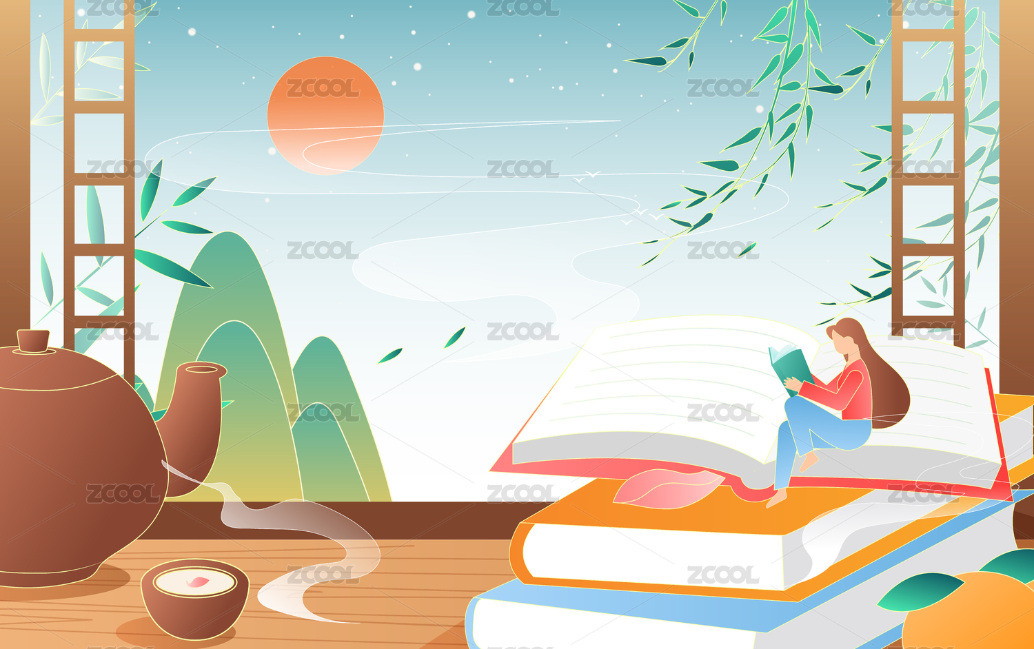 国风女孩阅读矢量插画