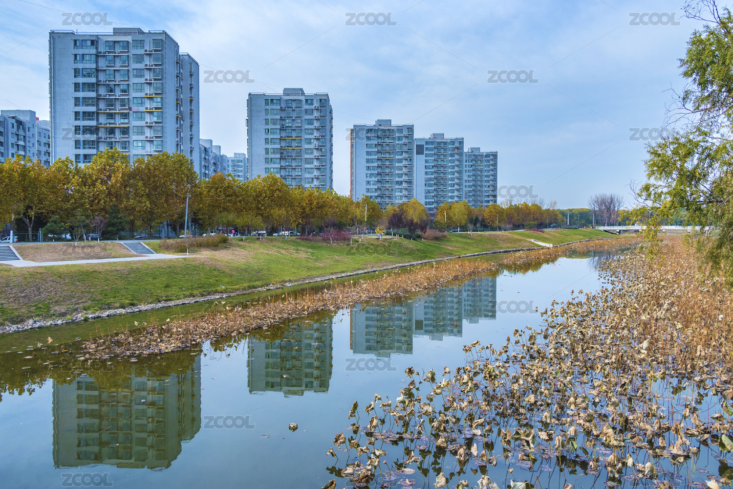 居民楼 水面倒影 秋景