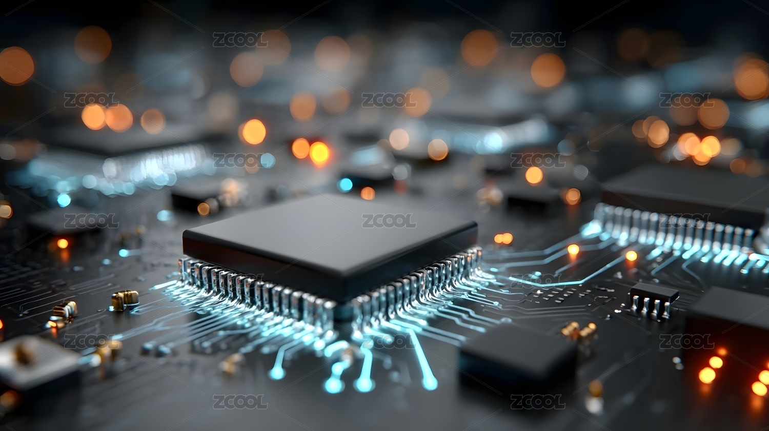 电路板中央的黑色芯片特写科技感十足