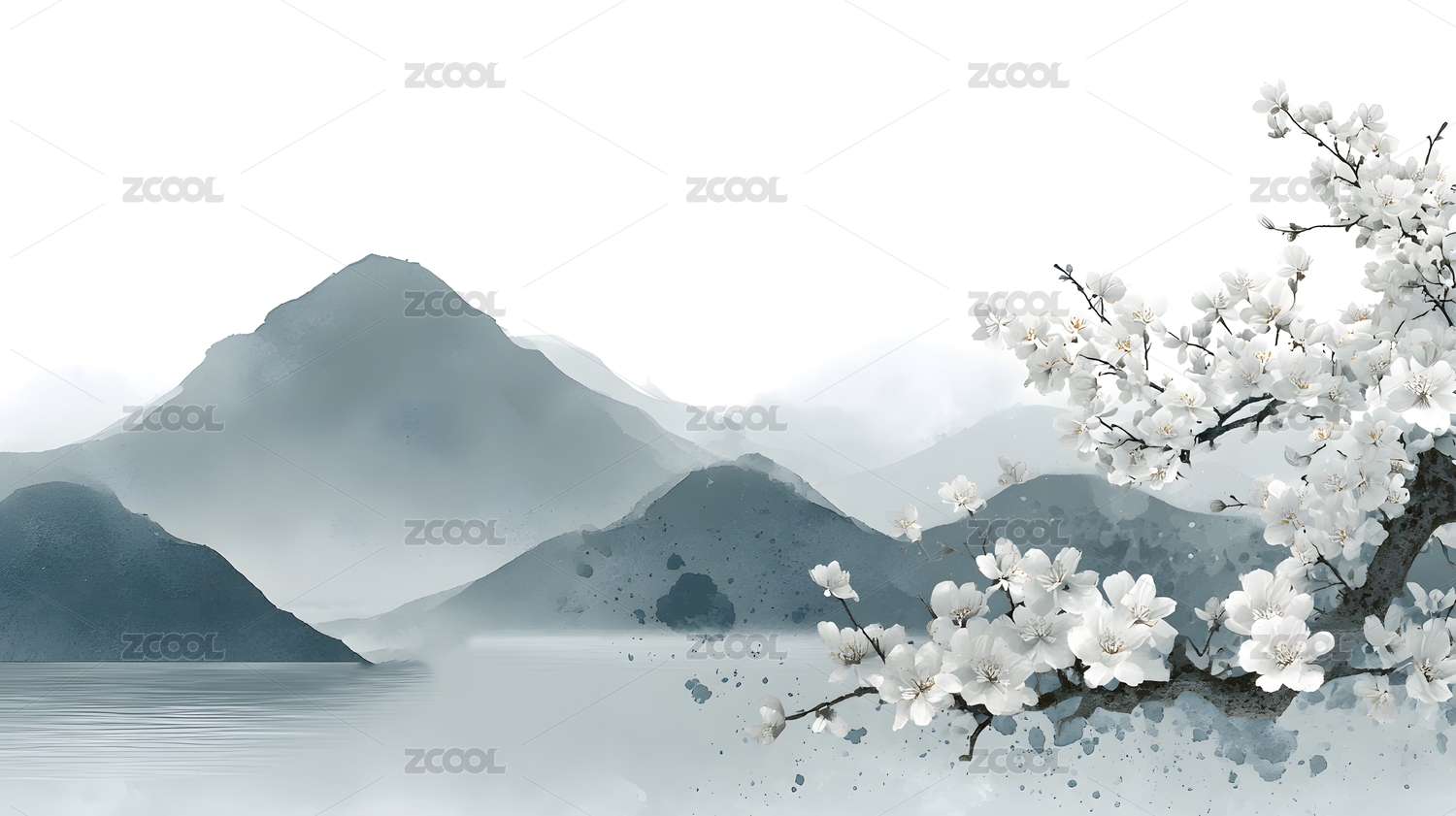 水墨山水间绽放的洁白花枝