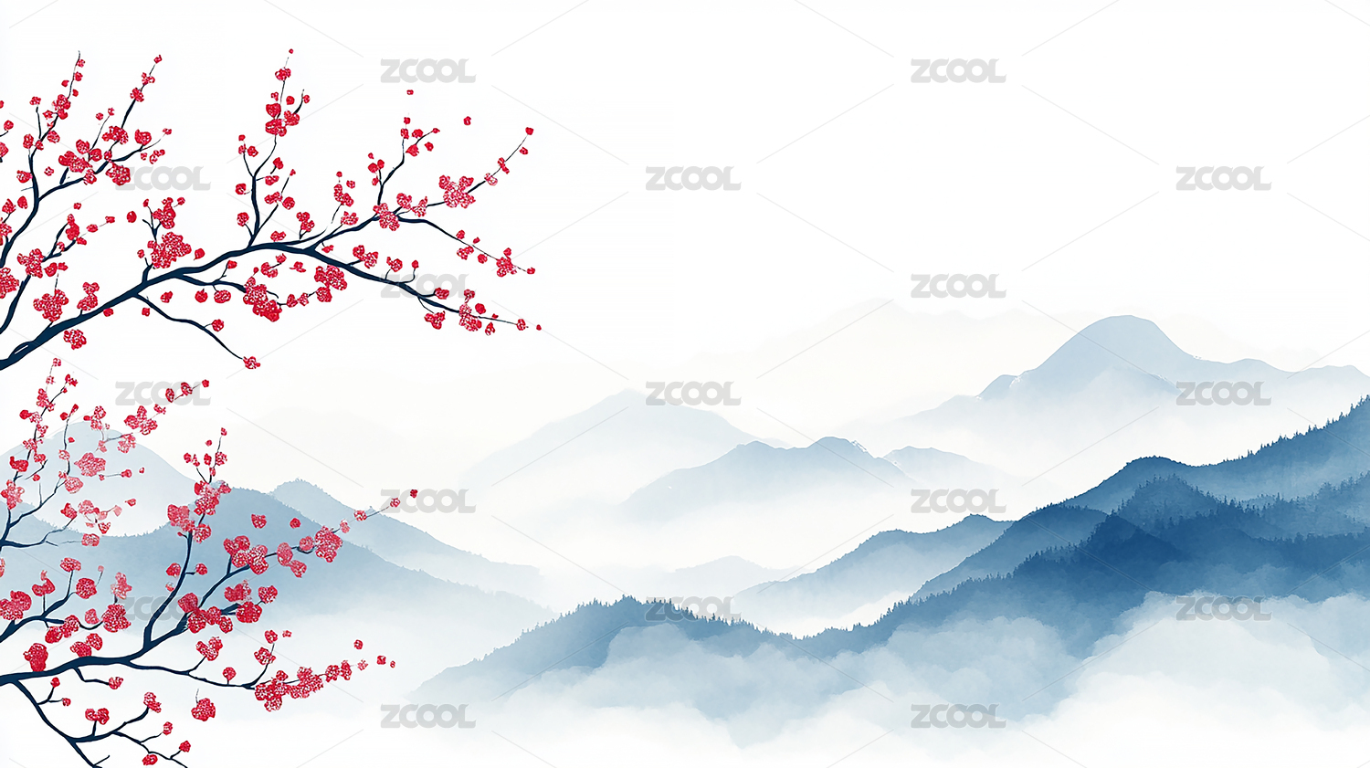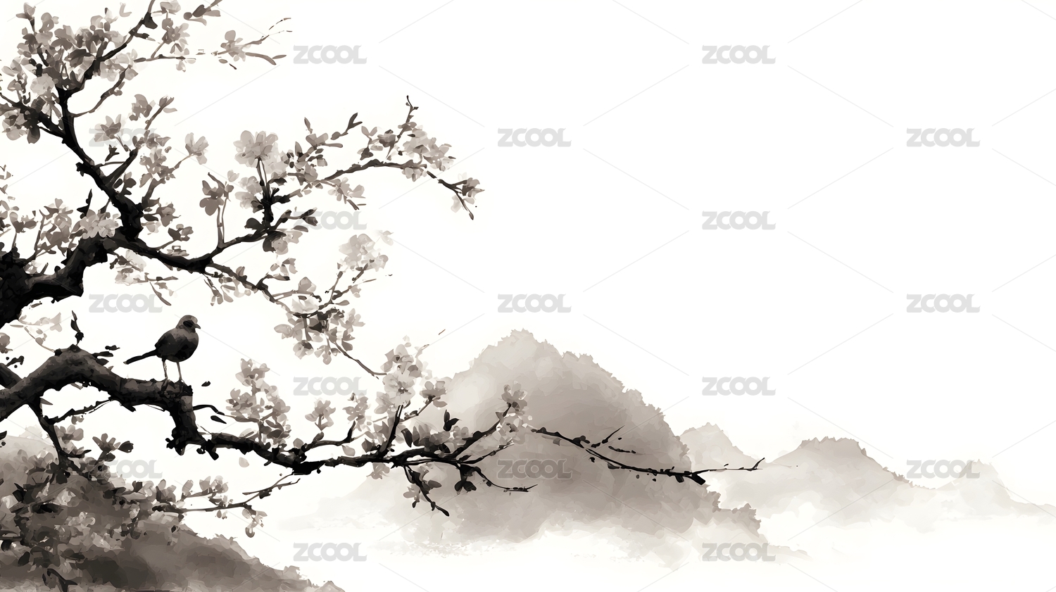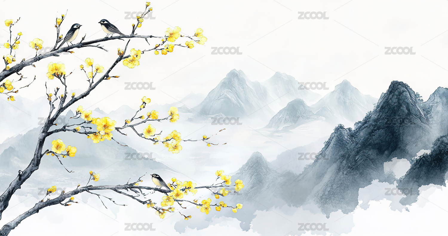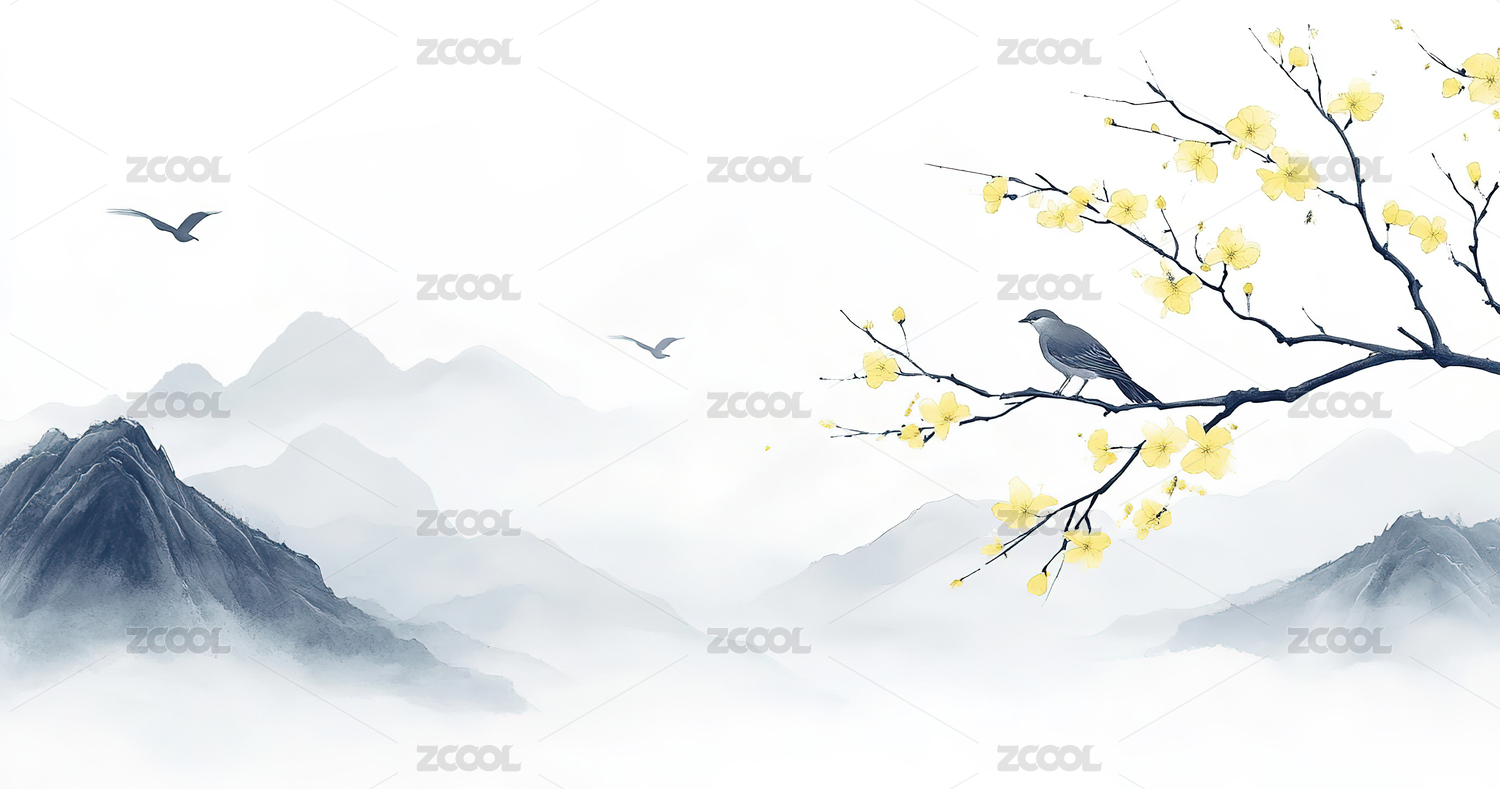 水墨风远山梅花树枝