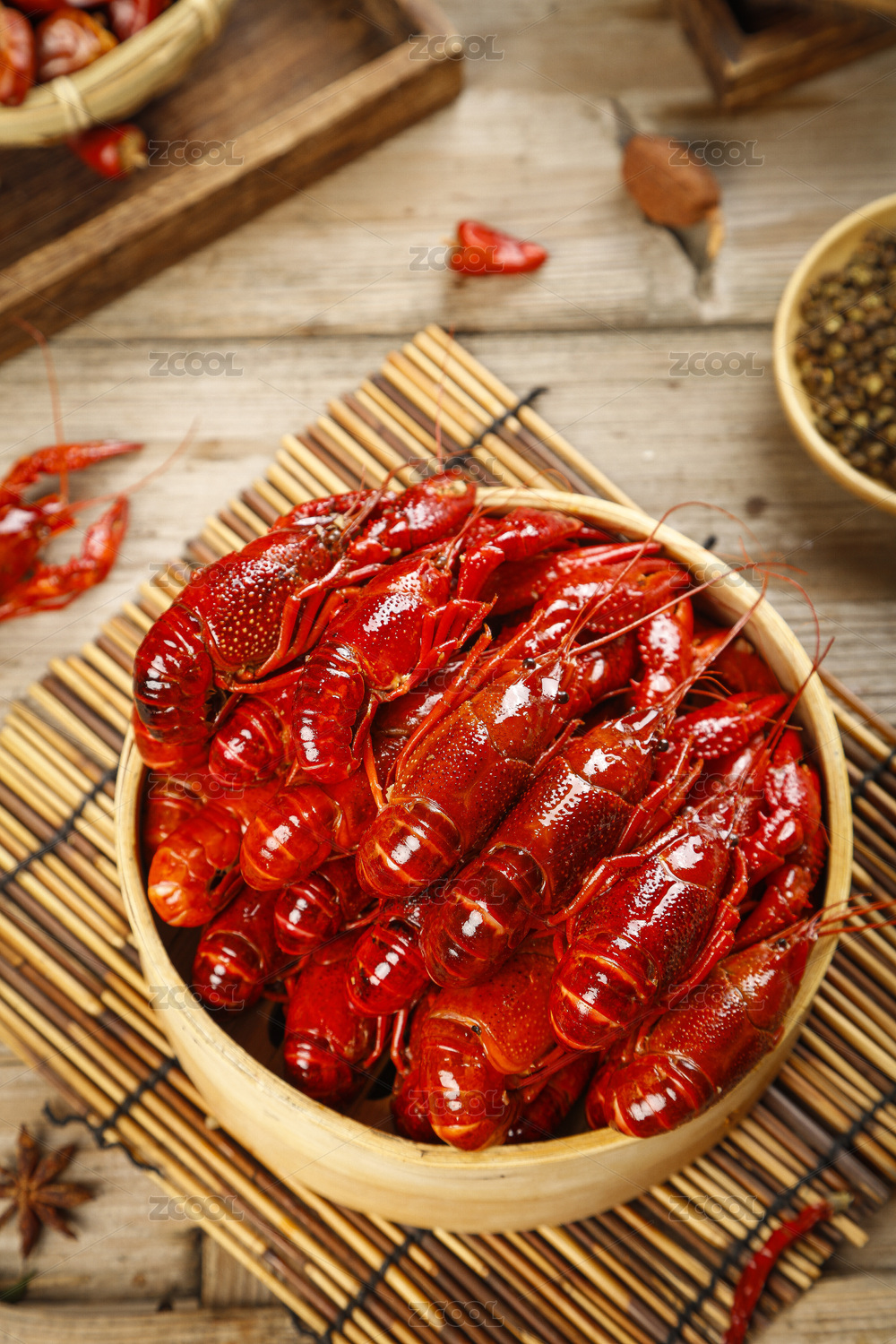 木桌上的清蒸小龙虾